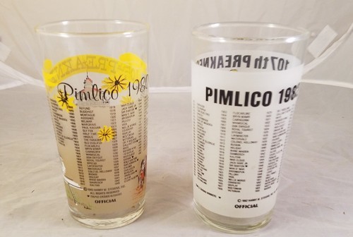 Up for sale is a lot of 8 Preakness stakes collectible glasses in great condition. The glasses do not have any chips and cracks The lot of 8 glasses include the years of 1975 - 1982, 1975, 1976, 1977, 1978, 1979, 1980, 1981, 1982. Most of the glasses are previously owned and in great condition with little or no signs of use. The 1978 glass is faded. The glasses measure 5 1/2" height x 2 3/4" diameter.