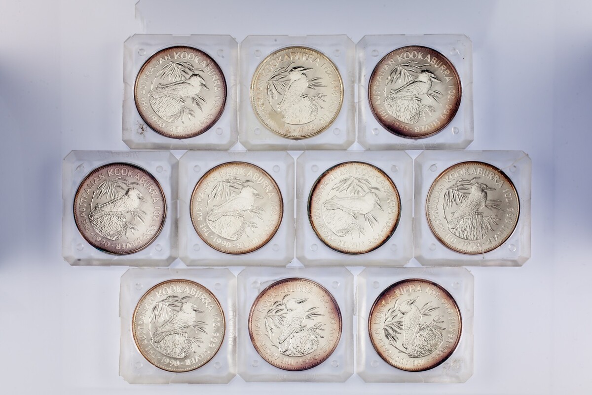 - Lote De 10 1990 Australia $5 Plata 1oz Kookaburras (Condición BU) KM# 189