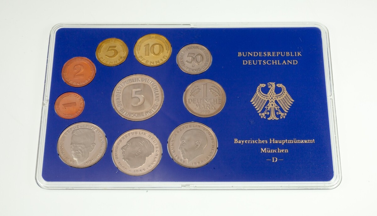 1980 Germania 10 Coin Proof impostata in caso rigido, 1 da pfennig a 5 Mark KM PS56
