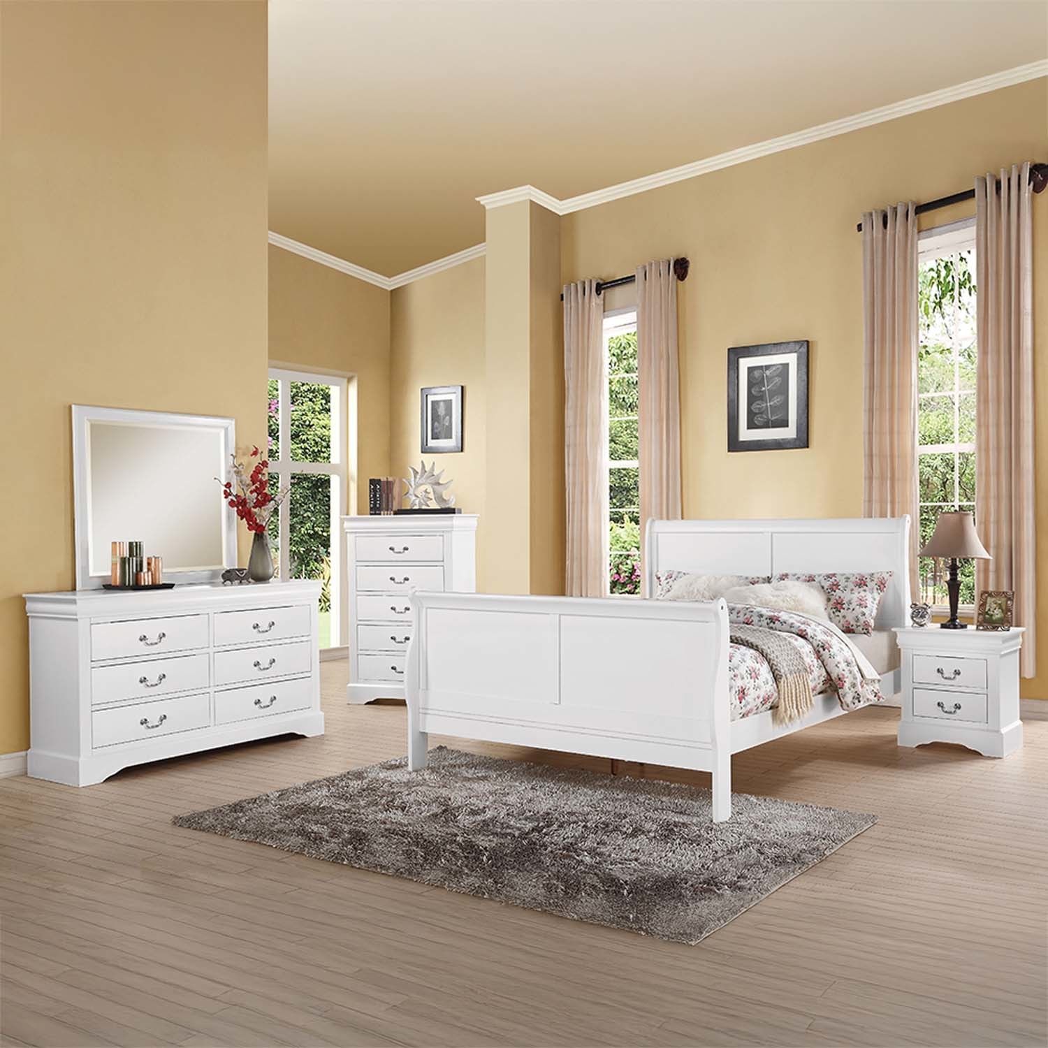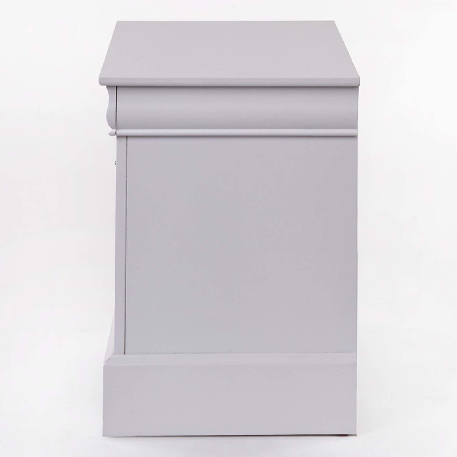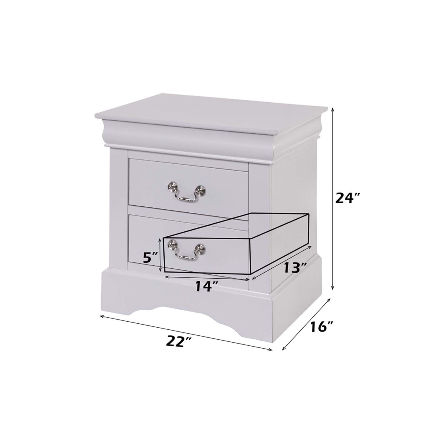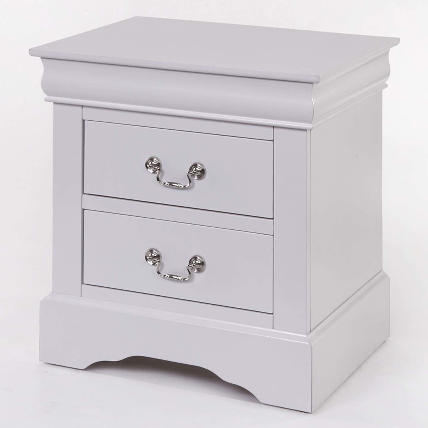 The Louis Philippe III collection nightstand comes in black, cherry, white, and antique gray finish. It has two drawers with center metal glide and brushed nickel metal handle. Offers you plentiful storage with spacious drawers