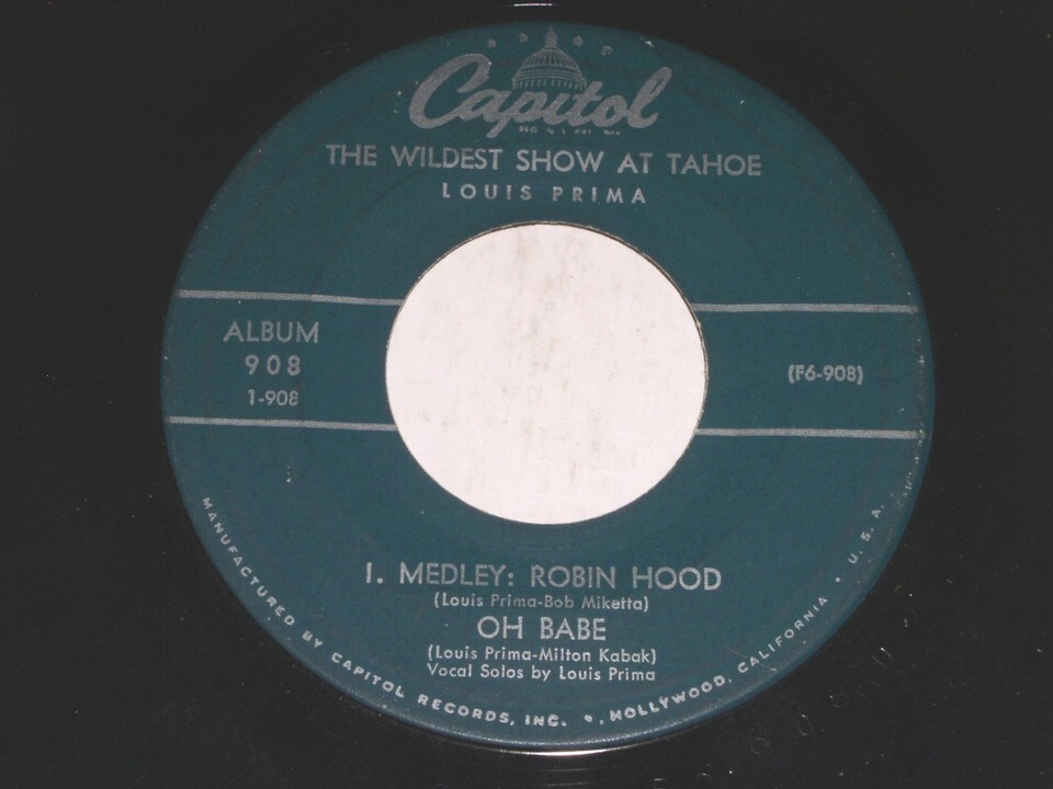 This is a vintage 45 rpm phonograph record by Louis Prima entitled, "The Wildest Show At Tahoe". Songs: "Medley: On The Sunny Side Of The Street/Exactly Like You". Flipside: "Medley: Robin Hood Oh Babe". Record Label: Capitol Album 908.