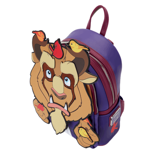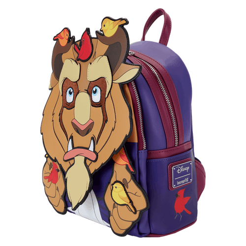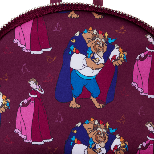 The Loungefly Disney Beauty and the Beast with Birds Mini Backpack is made of vegan leather (polyurethane). Backpack has padded adjustable shoulder straps, side pockets, and silver-colored metal hardware. Additional features include applique, printed, and embroidered details. Take note of the coordinating inside lining.