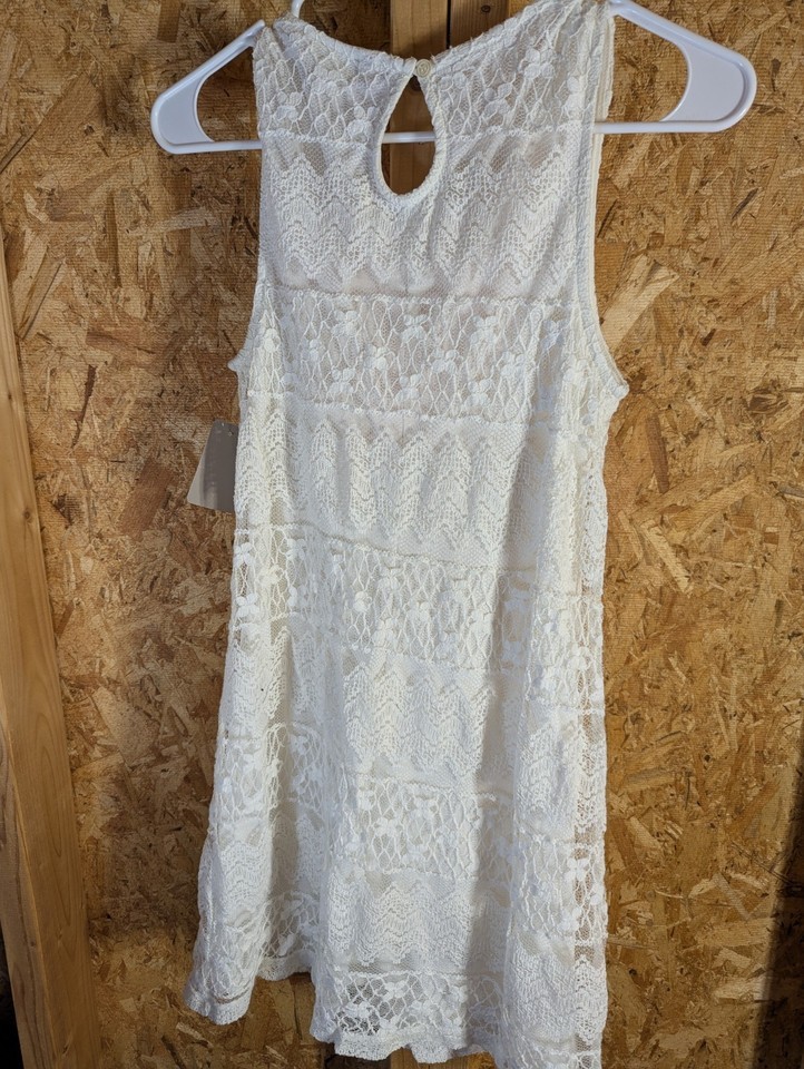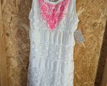 The Love Fire Medium Cotton Blend Shell Tank with Polyester Lining is a stylish and versatile top perfect for various occasions such as travel, parties, and casual wear. Featuring a floral pattern in white and pink tones, this sleeveless tank has a round neckline with a button closure. Made from a comfortable cotton blend fabric with a lace texture, this vintage-inspired top is machine washable and easy to care for. The regular fit and basic style make it a flattering and trendy addition to any wardrobe for the summer, fall, and spring seasons. 27" chest and 31" length