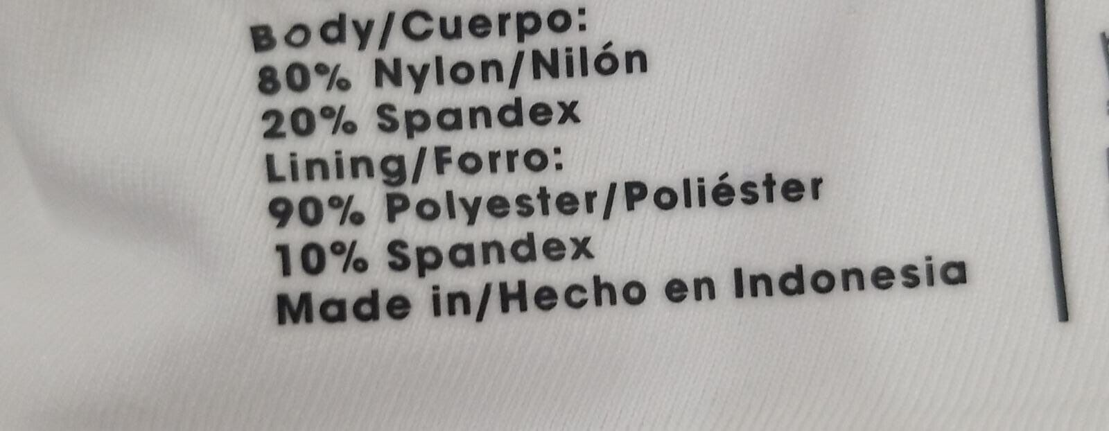 Material: 80% Nylon/20% Spandex; Lining: 90% Polyester/10% Spandex