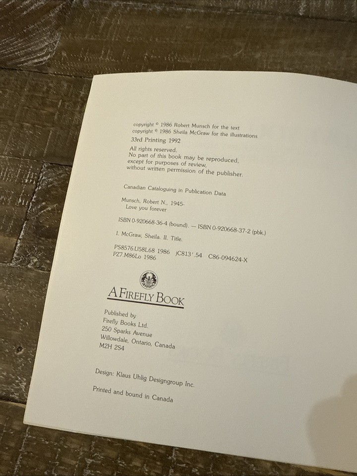 The "Love You Forever" paperback book by Robert Munsch, published by Firefly Books, The Limited in 1995, is a charming tale of love and romance suitable for juvenile fiction. With beautiful illustrations by Sheila McGraw, this trade paperback edition measures 8 inches in length and height and contains 32 pages of heartwarming story. Perfect for bedtime and dreamtime, this classic book also touches on themes of family and new babies, making it a delightful addition to any child's book collection.