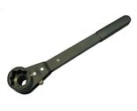 Designed with a bolt-thru configuration, the wrench allows bolts to pass entirely through both the socket and arm head, which is ideal for fastening nuts along any length of threaded rod. The integrated ratchet mechanism is enclosed for protection and includes a reversing lever at the head for efficient directional changes.