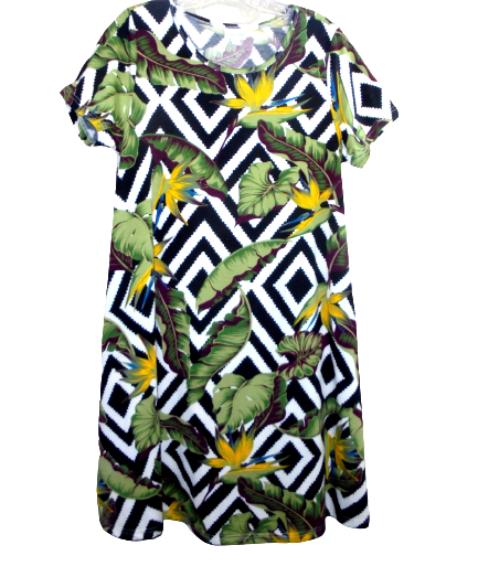 Description: Model - Simply Comfortable. Fun bold safari tropical print. Pullover. Flutter sleeves. Stretch knit. Fit and flare. Round neck. Great for summer!