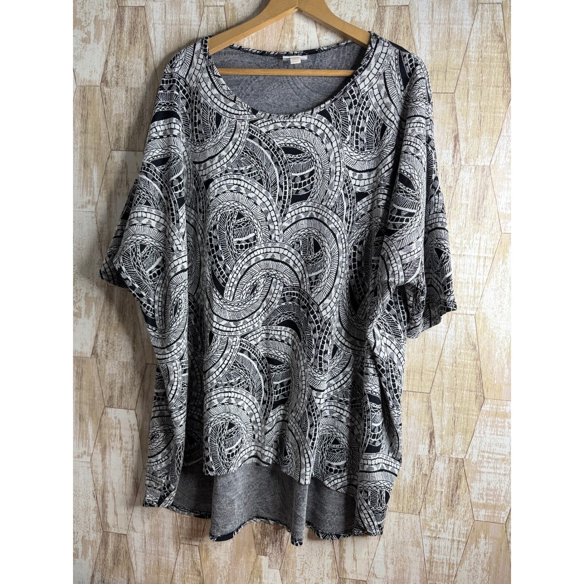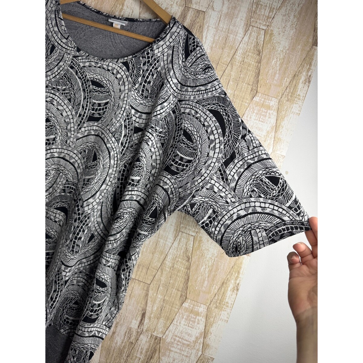 Keywords: LuLaRoe top, women's plus size shirt, 3XL top, black and white print, abstract pattern, kimono sleeve, oversized shirt, casual top, comfortable shirt, plus size fashion, flowy top, boho print, statement top, easy care top