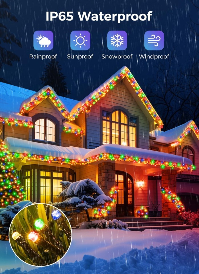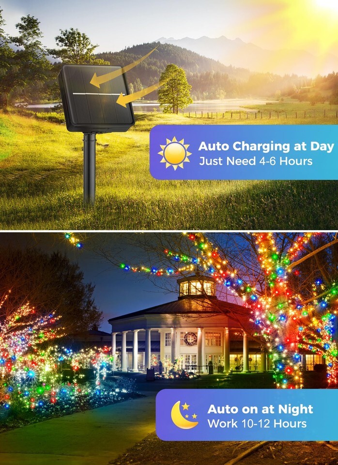 8 Lighting Modes: This solar christmas lights outdoor have 8 different lighting modes, including Combination, Waves, Sequential, Slo-glo, Chasing/Flash, Slow Fade, Twinkle/Flash and Steady-on. You can adjust different lighting modes according to different situations and mood