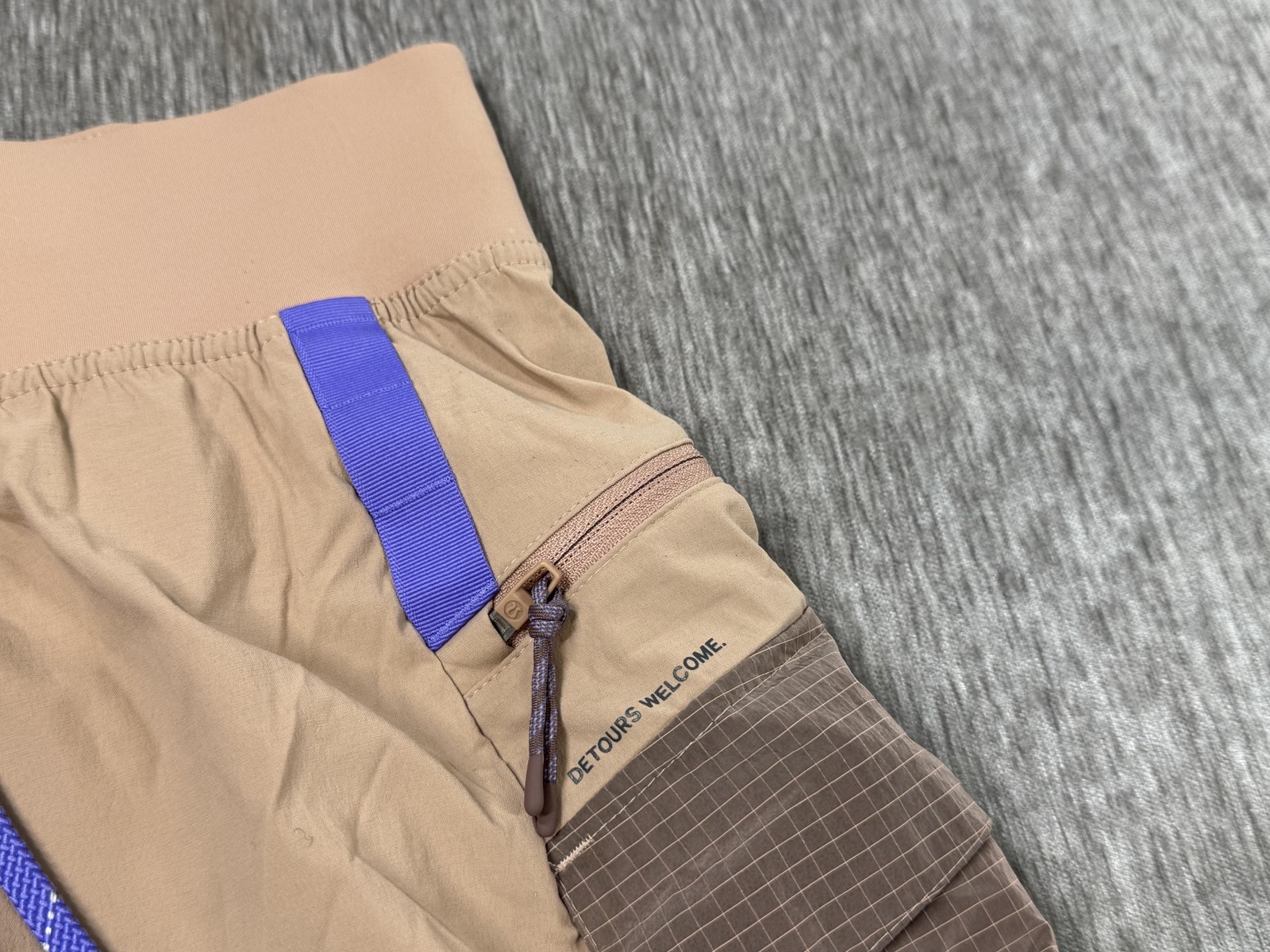 Design details: Wide high-rise waistband with external drawcord; front zip pocket; dual cargo pockets with grid ripstop overlays; gear/webbing loops; printed slogan "DETOURS WELCOME."
