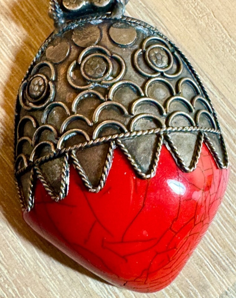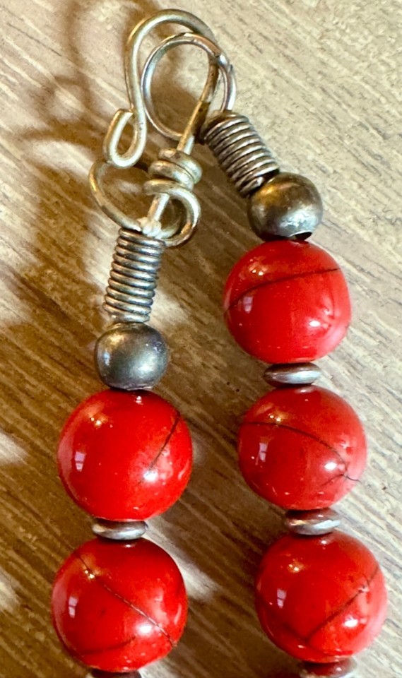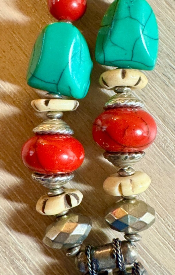 Faux bright red coral, turquoise, carved bone and silver will brighten up most outfits.