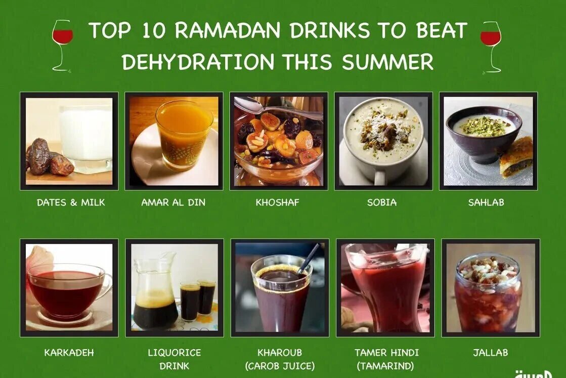Sweetened Karkadey (hibiscus rose petals), Kharoub (Carob Juice), Tamr Hini (Tamarind), Date Shake (Doum Tamar Dates ??? ????) Date Shakes are the prevalent drinks found at most hotels and coffee shops during Ramadan.
