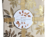 This rectangular tablecloth measures 60 x 84 inches and features metallic gold leaves on a beige background.
