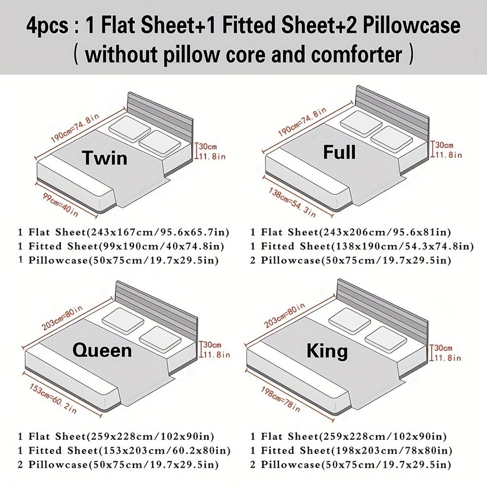 4-Piece Set Includes: 1 Fitted Sheet, 1 Flat Sheet, 2 Pillowcases