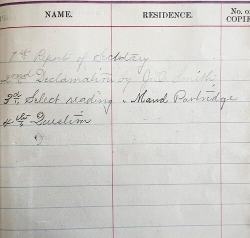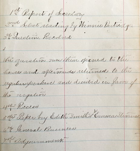 A Lyceum meeting held in Maine at the Norway School house in Maine with minutes by members on topics such as Woman's suffrage. Historical document. Some pages are loose, some are blank. 6 pages total