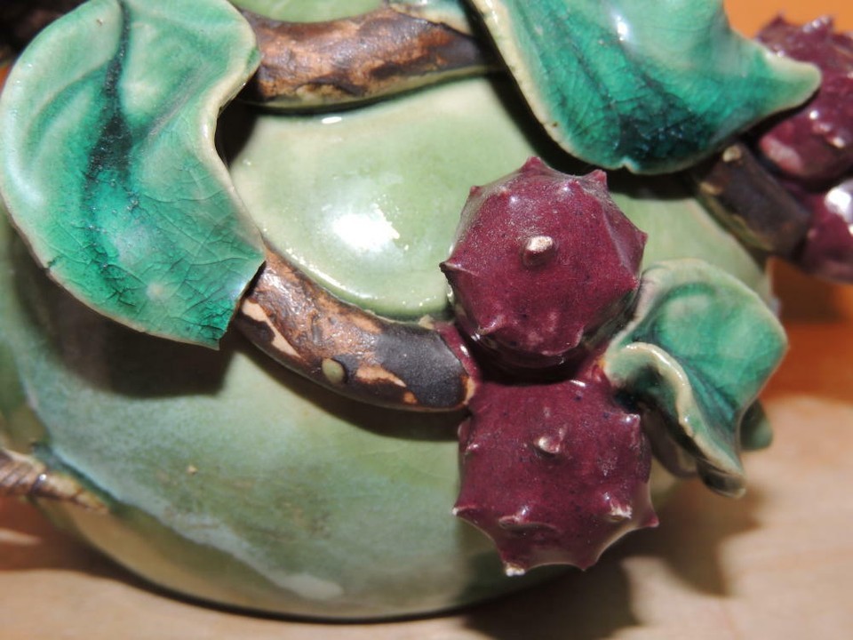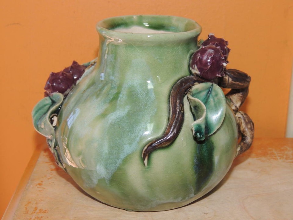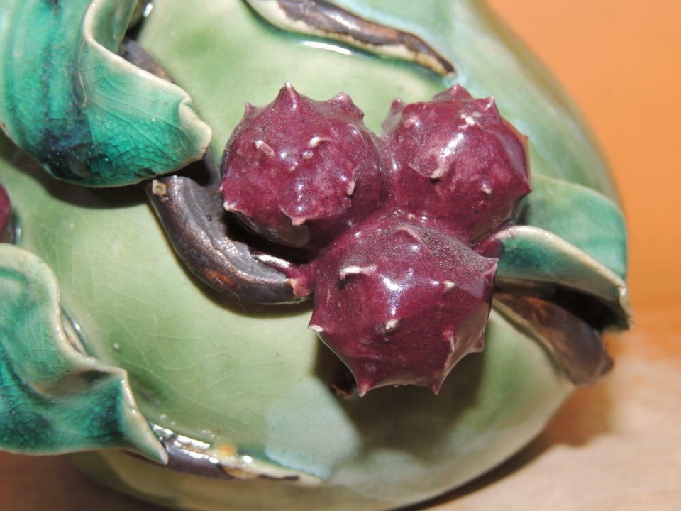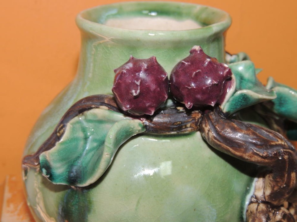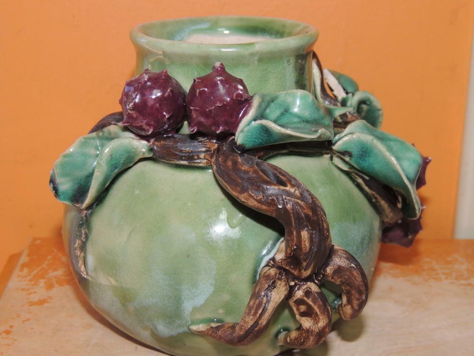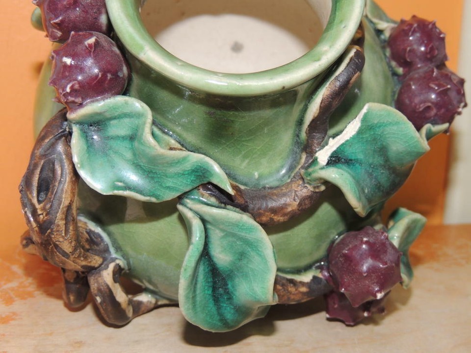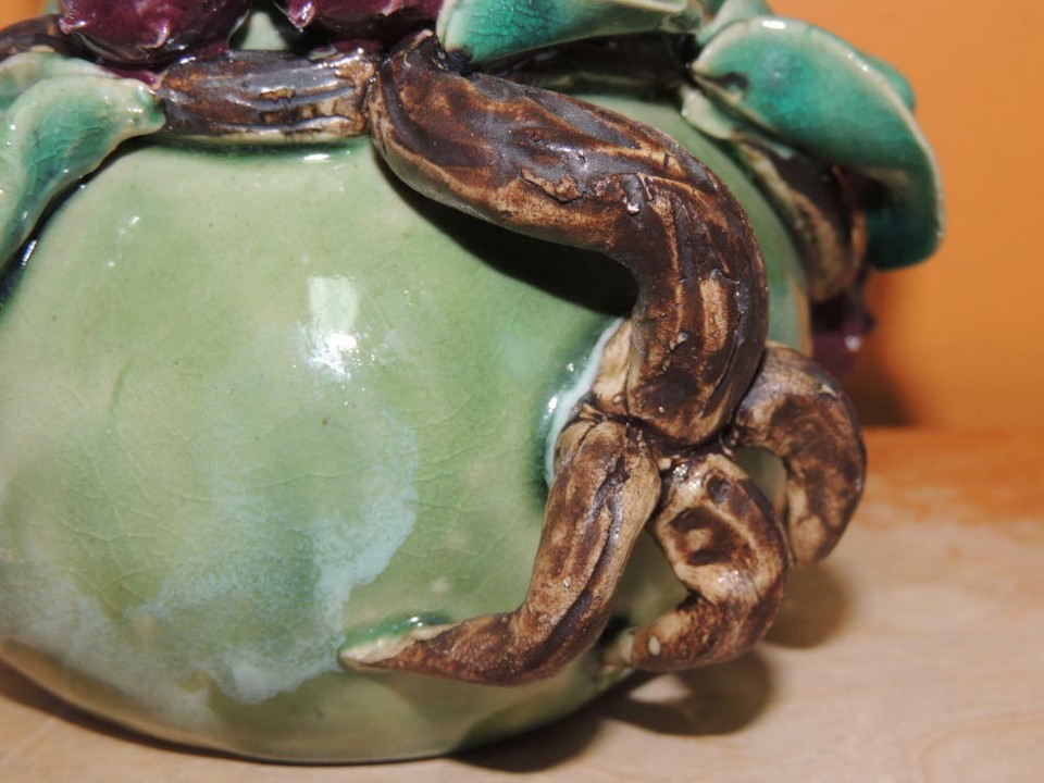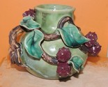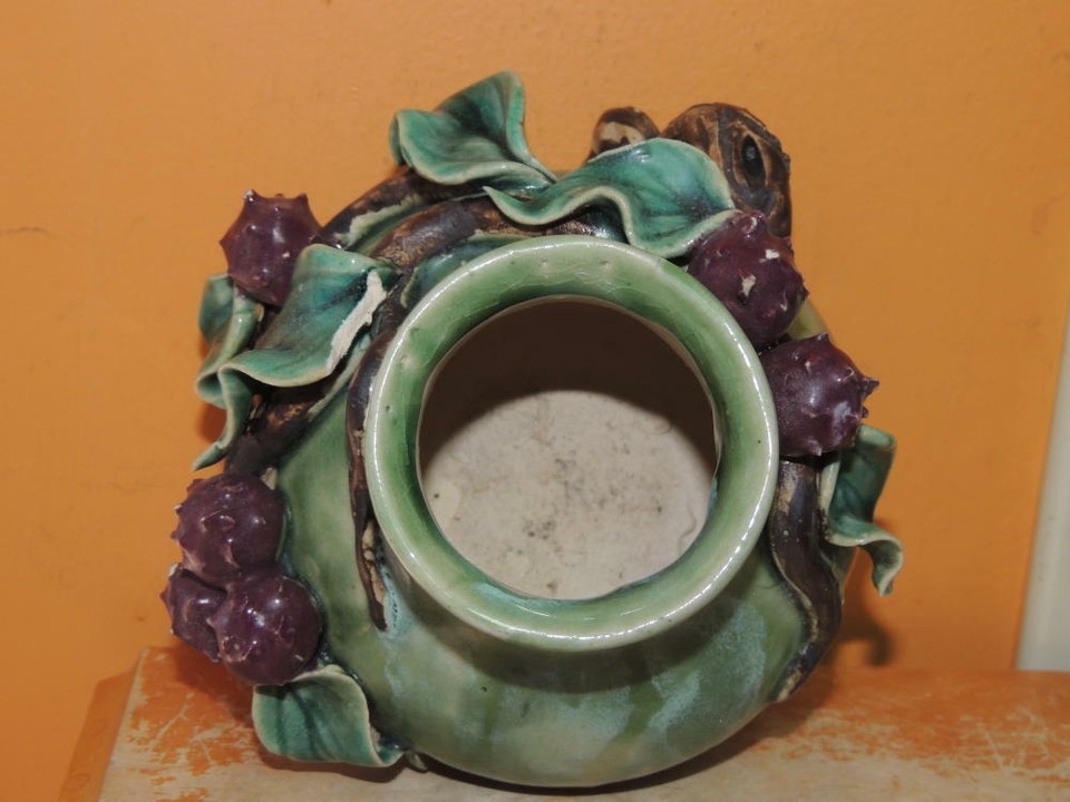 - Lychee Fruit Branch 5"x4.5" Chinese Vase Planter Polychrome Drip Glaze Majolica