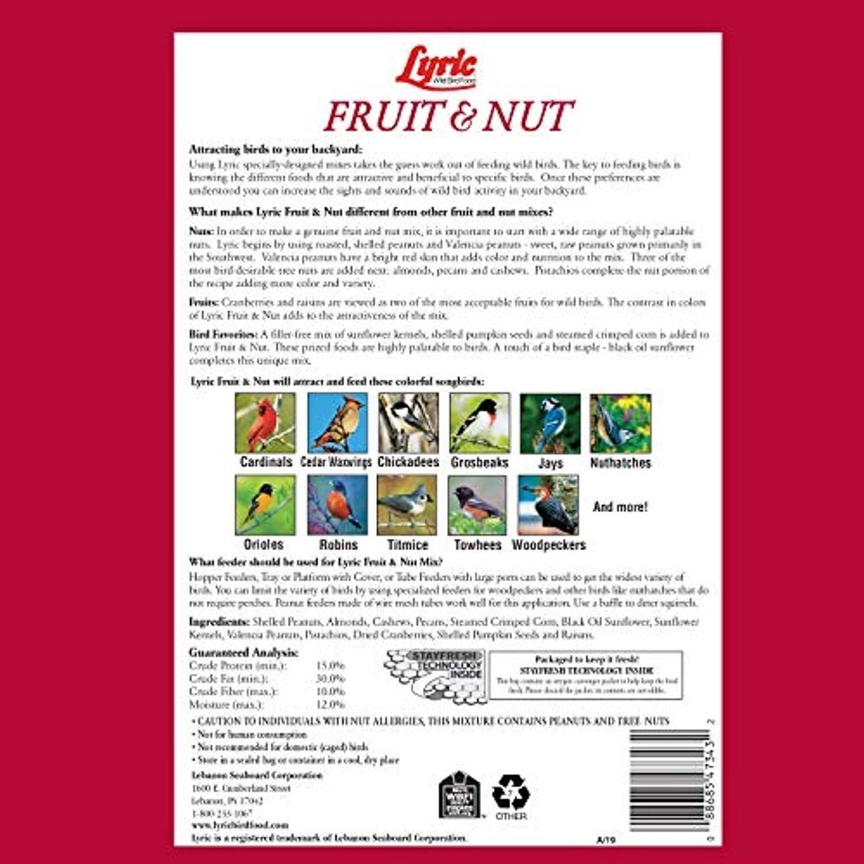 Lyric Fruit and Nut Wild Bird Food contains no fillers and provides high energy. Attracts chickadees, robins, orioles, Blue Jays, titmice, buntings, cardinals, grosbeaks, towhees, nuthatches and Cedar Waxwings. Contains nuts, roasted and shelled peanuts, valencia peanuts, almonds, pecans, cashews, pistachios, cranberries, raisins, sunflower kernels, shelled pumpkin seeds, crimped corn.