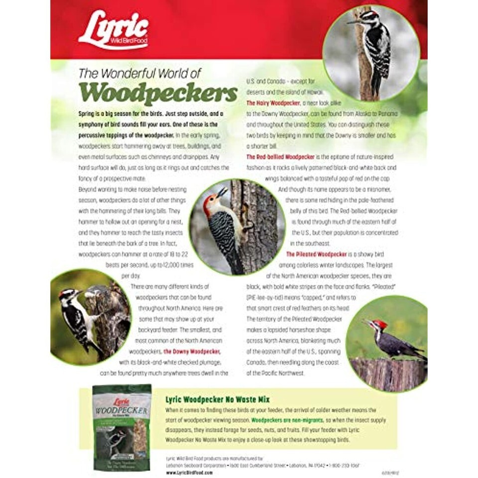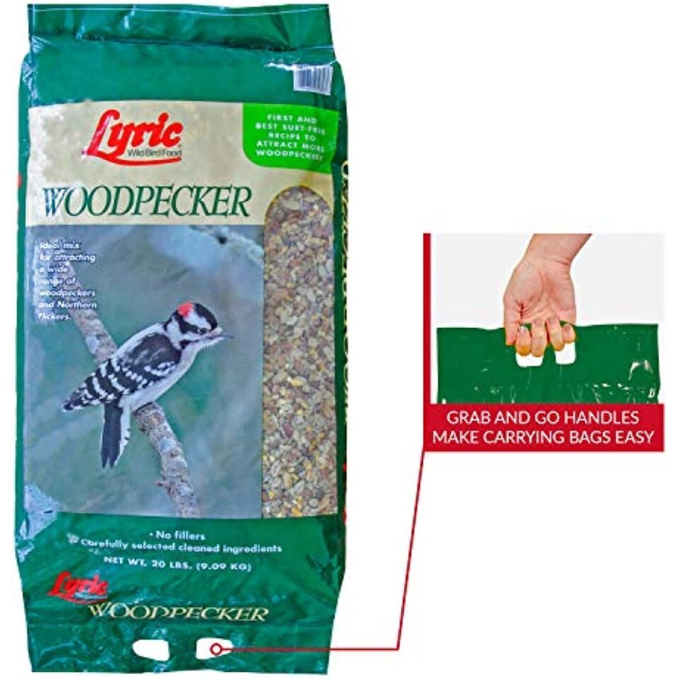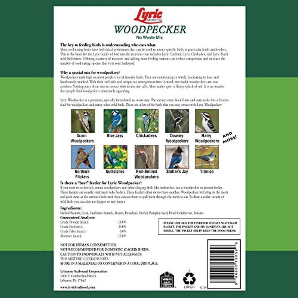 Woodpeckers, with their bright markings, feeding antics and recognizable calls are some of the most popular birds, and you can enjoy them, too. All you have to know is what they prefer to eat offer it in a selective feeder - and you have got woodpeckers. Lyric Woodpecker Mix is designed to do just that. Each ingredient has been tested, and it's a fact nutmeats, dried fruits and whole kerneled corn make an ideal woodpecker food. Woodpecker mix ingredients are cracked corn, shelled peanuts, sunflower kernels, tree nut pieces, shelled pumpkin seeds, raisins.