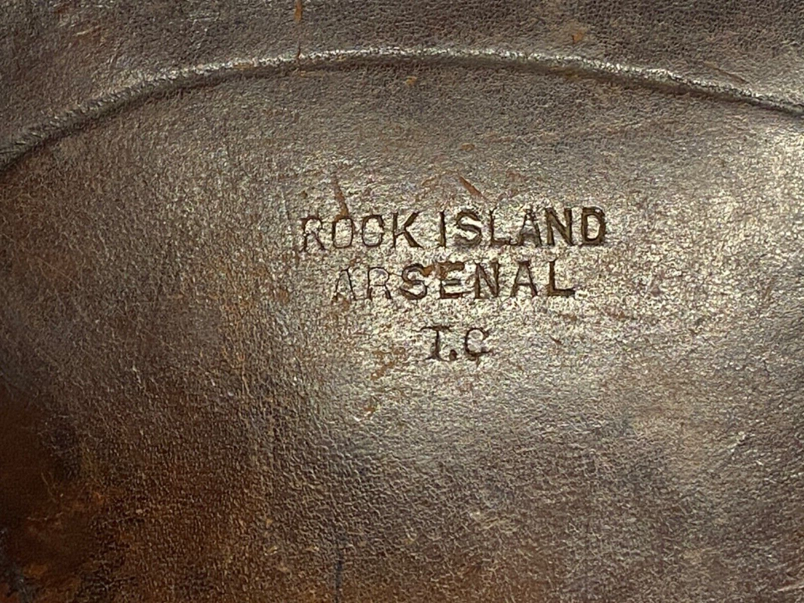 This very nice example of the rare Model 1902 Carbine Scabbard is made of russet leather and features the brass throat plate. Measuring 31? long, the scabbard is full form, and is complete with both of the original full length leather straps which buckled directly onto the saddle ? the snap hooks featured with the later scabbards had not yet been adopted. The straps are complete with the buckles, standing loops and sliding leather keepers. The scabbard is legibly stamped ?ROCK ISLAND ARSENAL? with the worker?s initials ?TC? for T. Carroll.