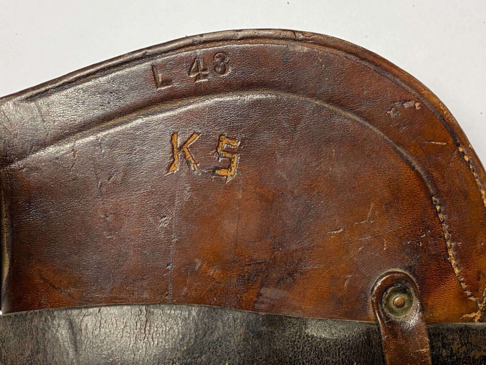The top edge of the scabbard throat is stamped with a set of unit inventory letters and numerals, ?L 43?, indicating this scabbard was in the inventory of Troop L, of the famous 10TH US Cavalry, and was assigned the inventory number 43. The initials ?KS? were carved into the leather just below the numerals ?L 43?. While showing signs of having been issued and used, this scabbard has survived in very good condition with the stitched seam intact and all the components present. The leather surface retains an overall clean surface and the leather has a pleasant medium caramel color as do the straps. The leather is overall smooth, with some of the expected wear to the surface from being carried on a saddle with no flaking or surface loss. The leather is live, the scabbard still holds it shape, and it would display very well. There are no steel plates to form the drain hole in the lower tip, however the drain hole is open. An especially nice example, this Model 1902 Carbine Scabbard would be an excellent addition to a Krag Carbine display, or to complete a First Pattern Model 1904 McClellan Saddle.