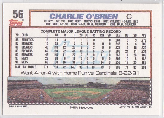 M) 1992 Topps Baseball Trading Card - Charlie O'Brien #56
