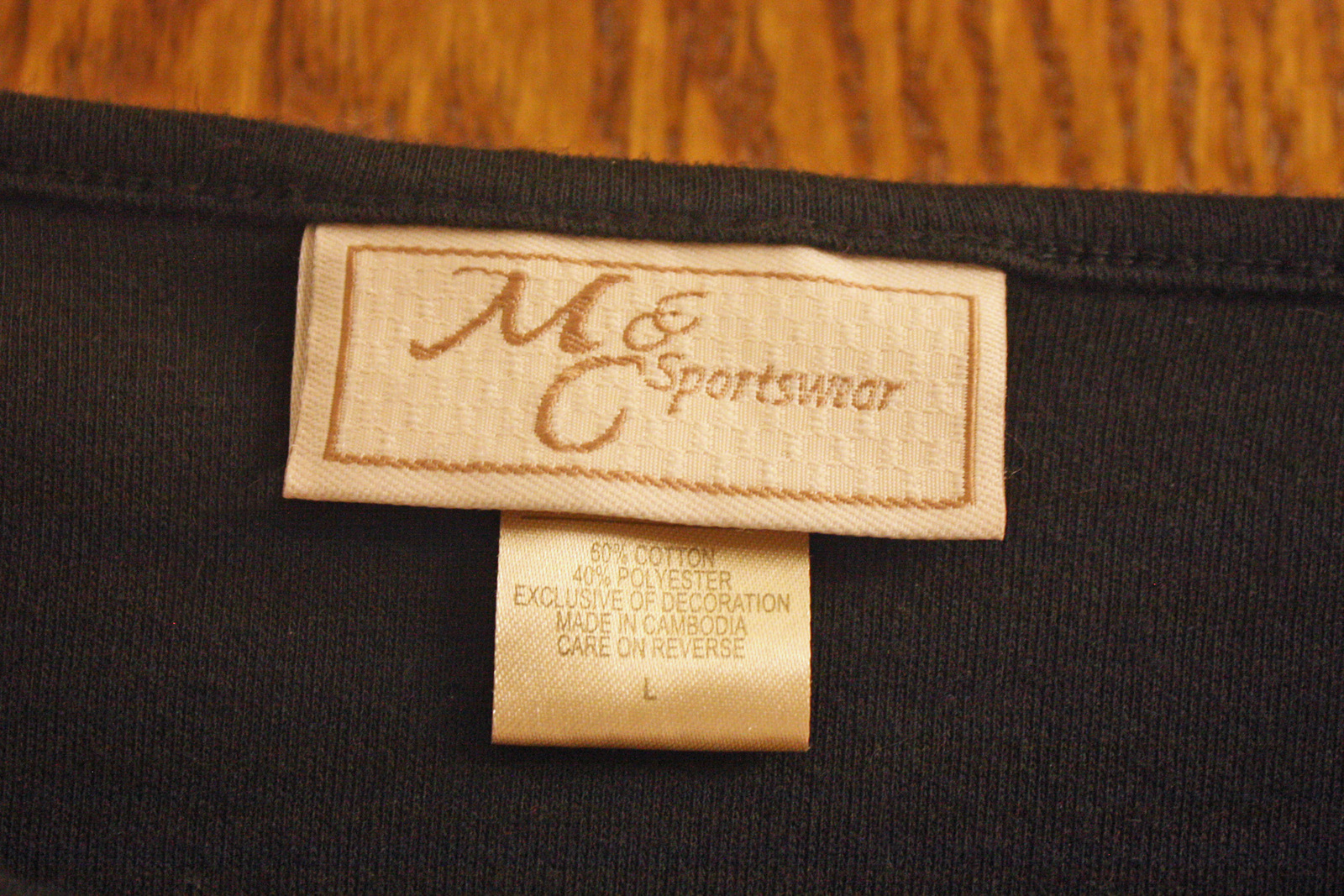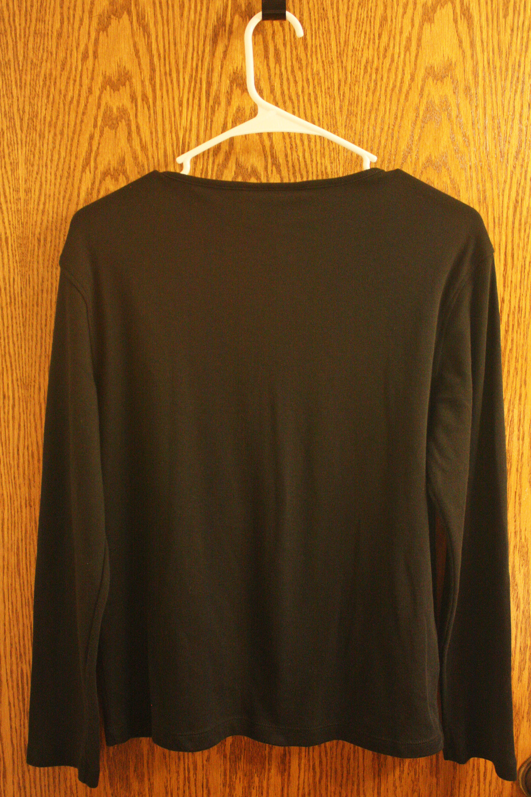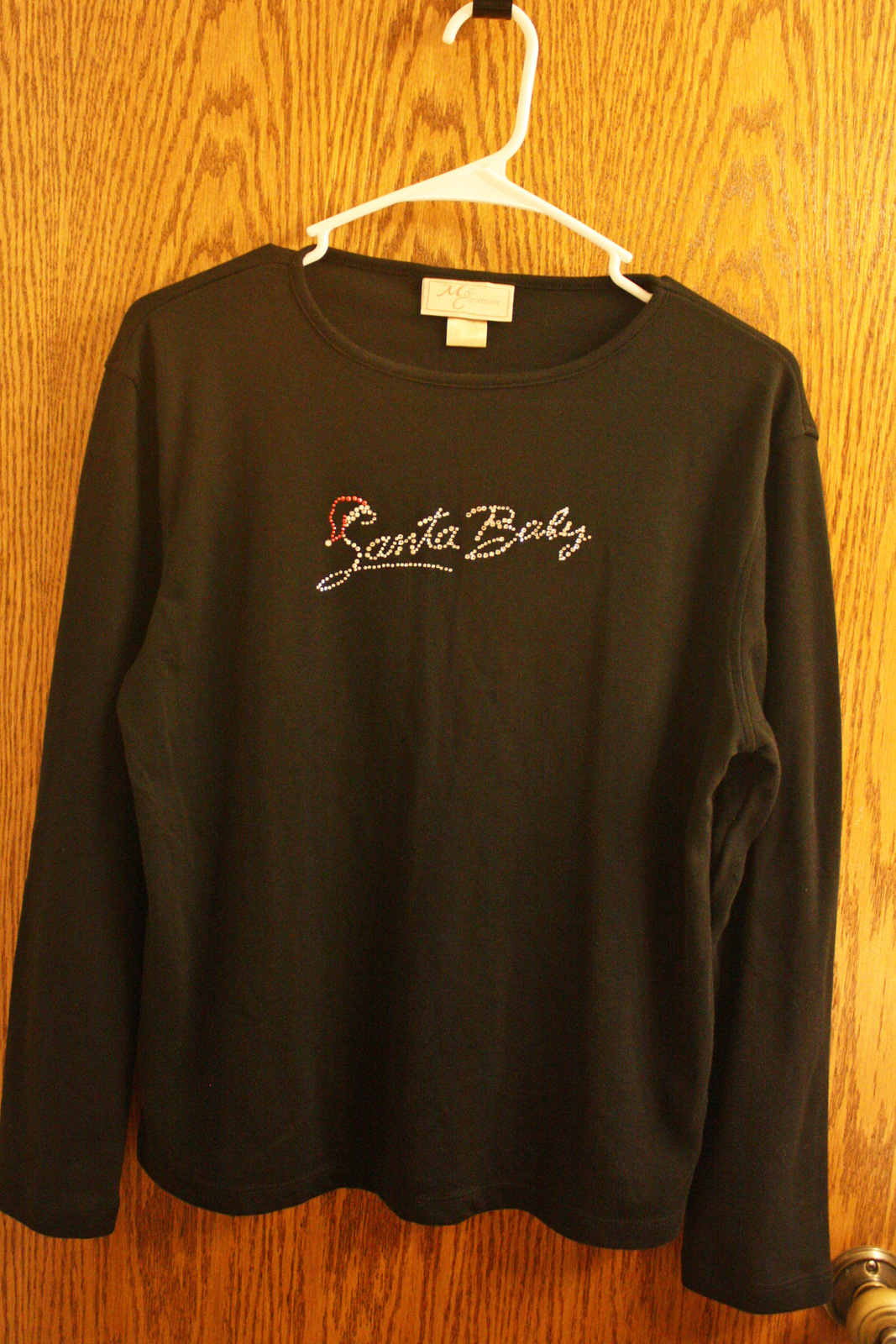 This is a M C Sportswear black long sleeve ladies shirt that is in excellent condition. It is size large. The fabric is 60% cotton, 40% polyester. The shirt is solid black with "Santa Baby" written out in rhinestones across the chest of the shirt. Hardly worn.