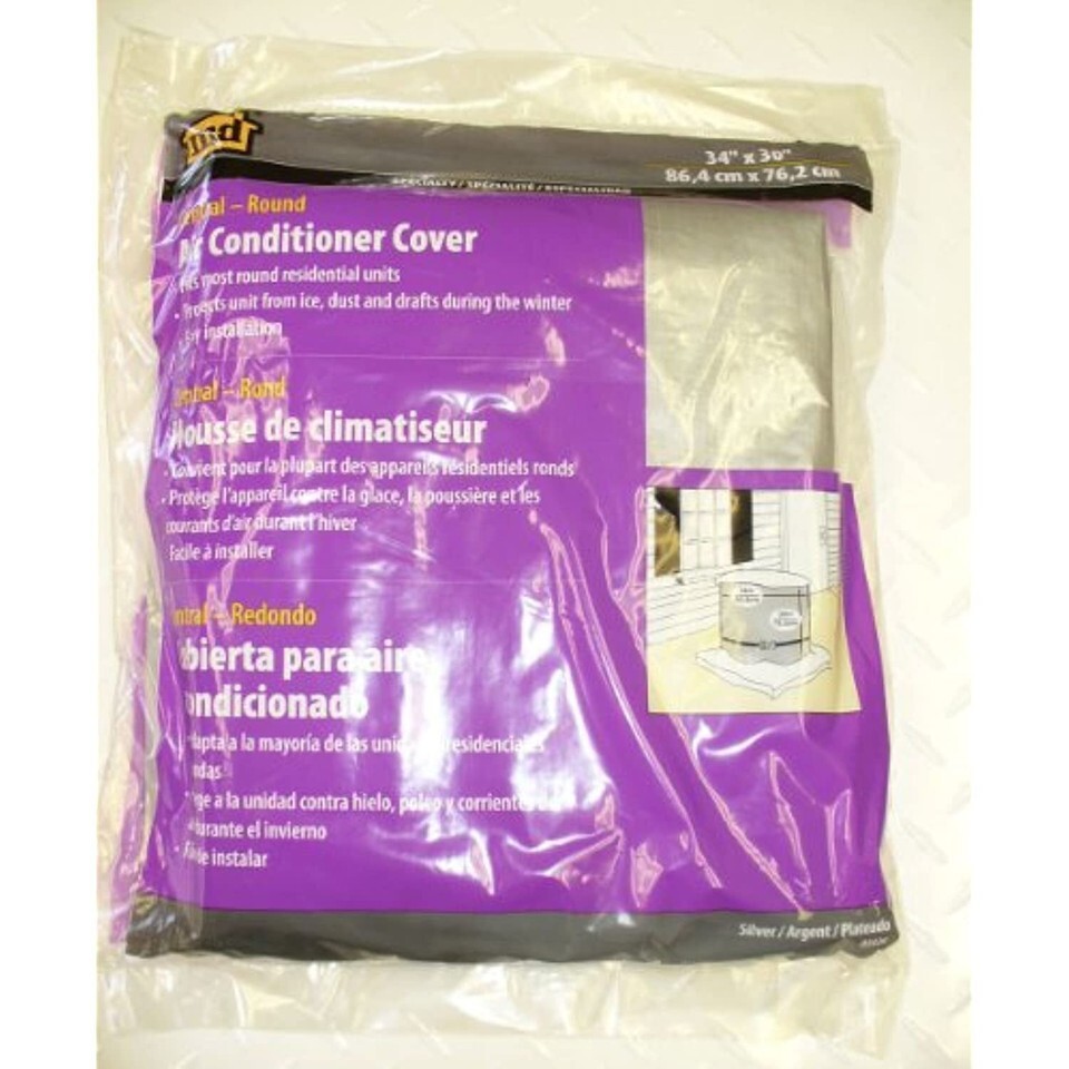 Product Description M-D Air Conditioner Cover, M-D, 34 in Width, 34 in Length, Fabric, Silver, 30 in Height, with Elastic Strap, For Fits Round Central Air Conditioner Units. Durable polyethylene blocks out water, ice, dust and leaves during off season. From the Manufacturer This Air Conditioner Cover protects your round central air conditioner unit to reduce maintenance costs. Expansion and contraction of ice during freeze/thaw cycles can cause unit damage. Protect unit by installing an air condition cover.