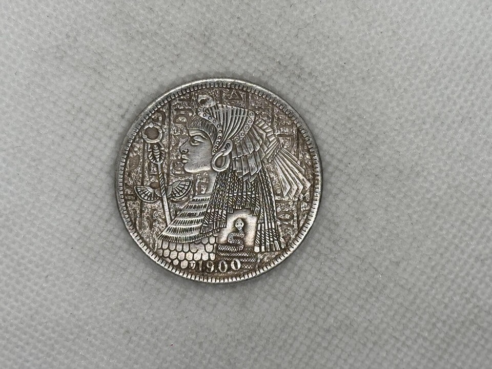 Presentation de la medaille fantastique de la deesse egyptienne, une piece moderne captivante inspiree du classique dollar americain Morgan de 1900, mais reinventee avec une touche artistique unique. Cette medaille presente une representation stylisee d'une reine ou d'une deesse egyptienne sur l'avers, ornee de hieroglyphes complexes et de symboles de l'Egypte ancienne, y compris des ailes, des serpents et le cobra sacre d'Uraeus. Ce design rend hommage a la fascination durable pour la culture egyptienne antique, presentant une reinterpretation creative de l'iconographie historique.