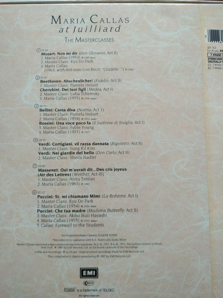- MARIA Callas At Juillard The Masterclasses EMI 1987 - 3 x LP 12" Vinyl VG/VG