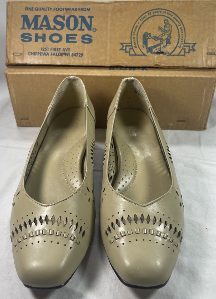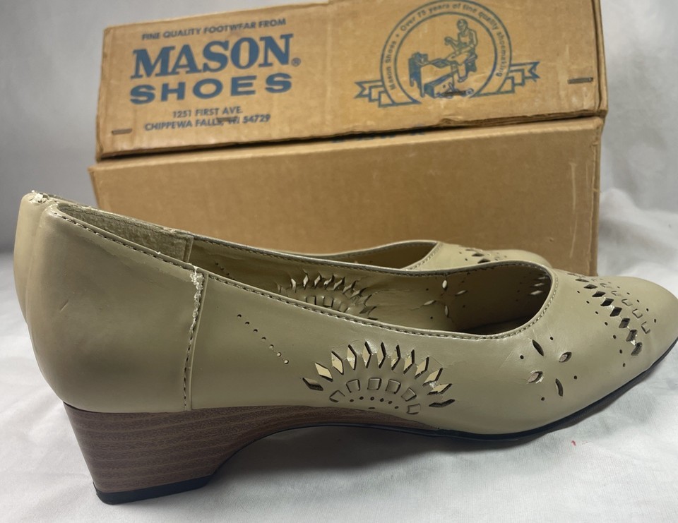 The MASON Leather Cutout Heel Dress Shoes in Tan are a stylish and classic choice for women. With a round toe shape and a low heel, these shoes are perfect for dress occasions. Made from high-quality leather, these pumps from the brand Mason offer a comfortable fit in size 8 with a medium width. The cutout design adds a touch of sophistication to the low heel classic style, making them a versatile addition to any wardrobe.