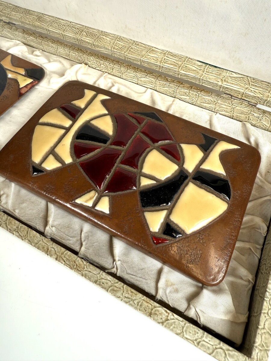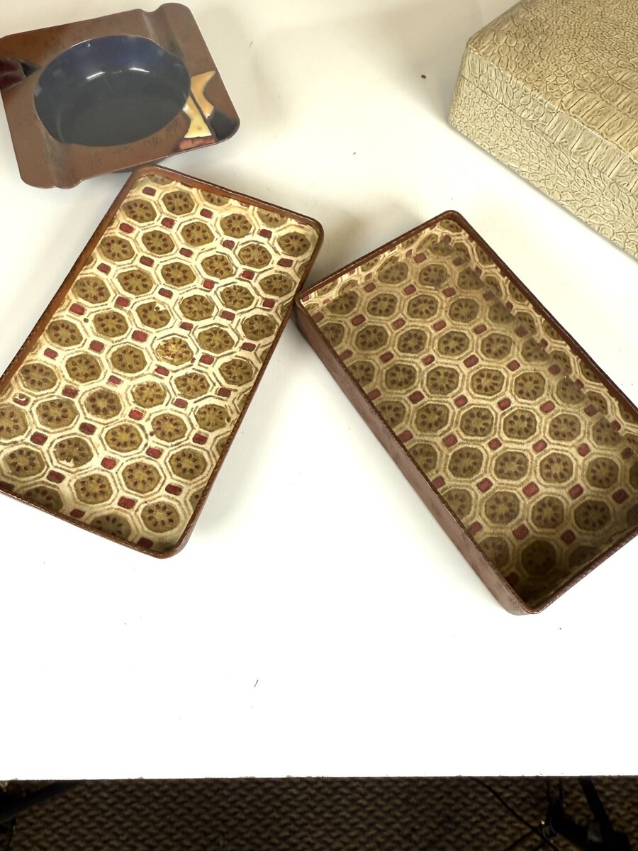 MCM Ando Cloisonne Japanese Trinket Box Tray w/ Display Box Original Papers. Very Nice Condition! Trinket box measures approx. 5.5" wide by 3.5" deep and the tray (or could be an ashtray) measures approx. 3.75" square. Very MCM Abstract Design! With original paperwork. Please see all photos.