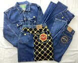 The MCM Denim Women 4-Piece Set includes a denim jacket in size small, two pairs of pants in size 27, and one skirt in size medium. All items are made of denim fabric in a classic blue color. The set is designed for women with a regular size fit and features zip closure and pockets. Perfect for all seasons, this set is a versatile addition to any woman's wardrobe.