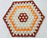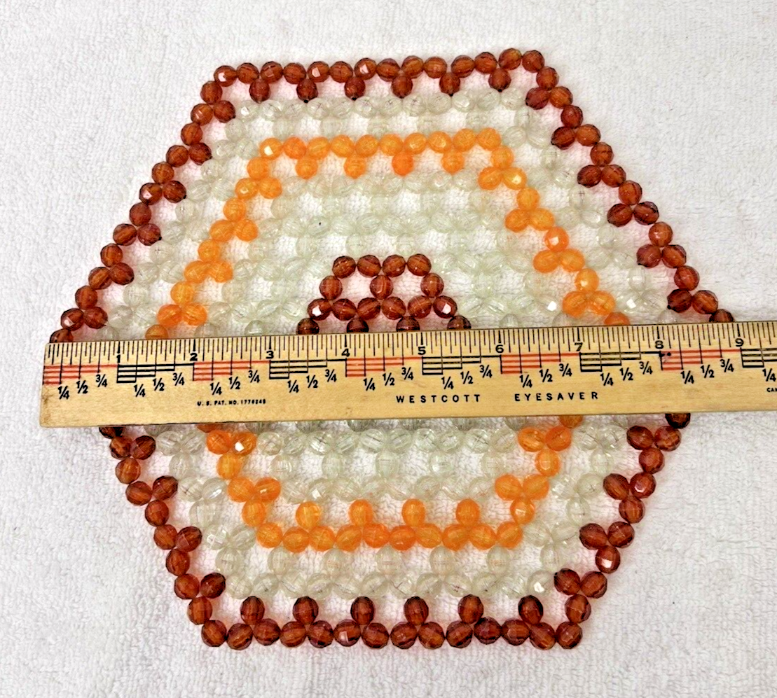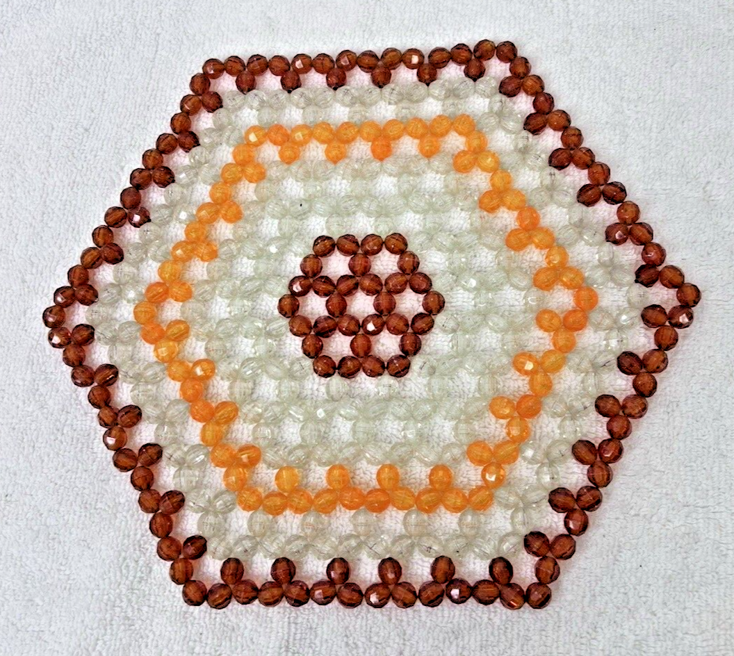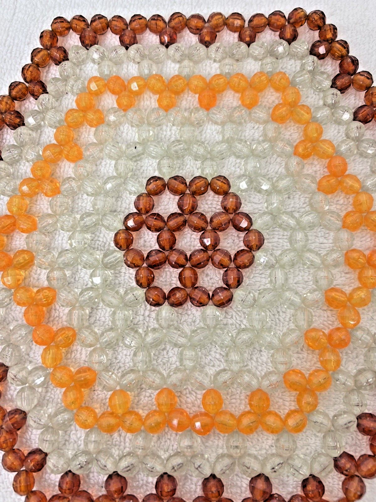 MCM Vintage Handmade Sparkly Beaded Trivit Doily Orange Brown Clear 9 Inch the beads are hard plastic and in great shape