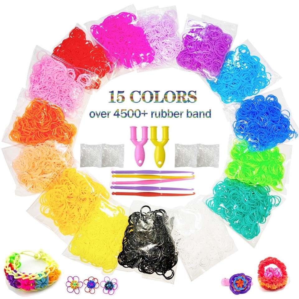 15 SOLID COLORS RUBBER BANDS: Rubber band bracelet making kit with 4500+pcs of rubber bands in 15 colors, 200pcs S-clips 2Pc Y-loom and 5pcs hooks