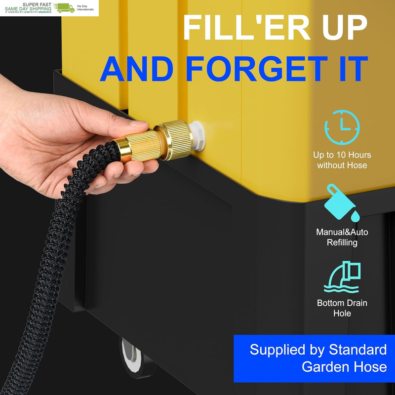 Large 10.6-Gallon Water Tank Flexible Water Refill Options:The built-in 10.6-gallon tank ensures extended cooling without frequent refills. An intuitive Low-Max water line helps monitor levels, while a bottom drainage port simplifies cleaning and maintenance. Enjoy uninterrupted cooling for hours with manual top-fill or connect a garden hose for continuous refilling?ideal for long-term use.
