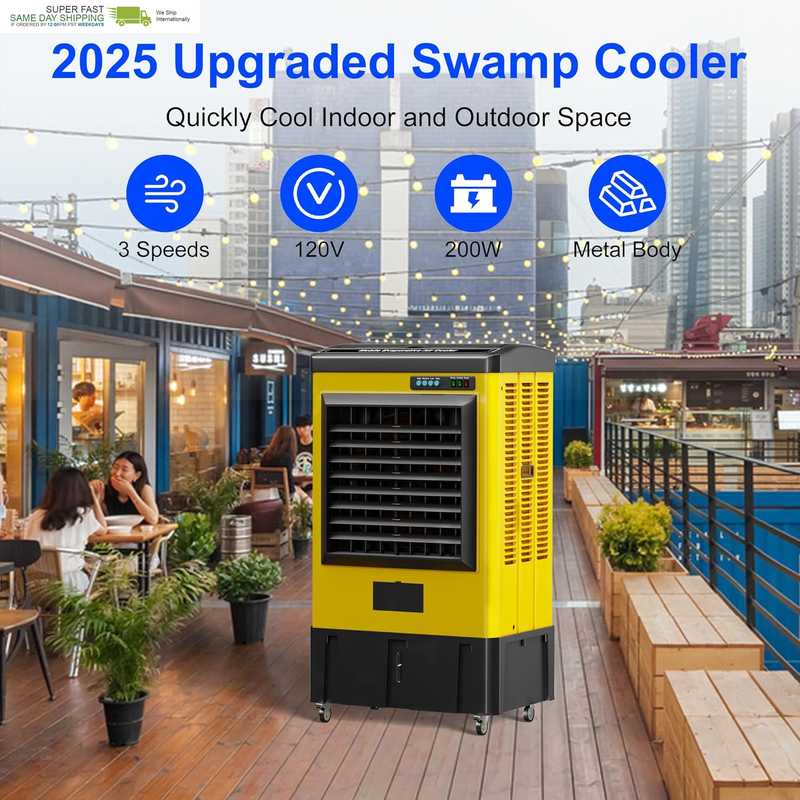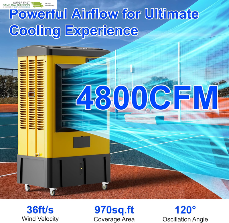 4800CFM Air Volume,970sq.ft Max Room Size, 10.6-Gal Large Water Tank,3 Ice Boxes, 3 Speeds,120 Oscillation,Galvanized Iron Material Manual Auto Continuous Fill, Portable