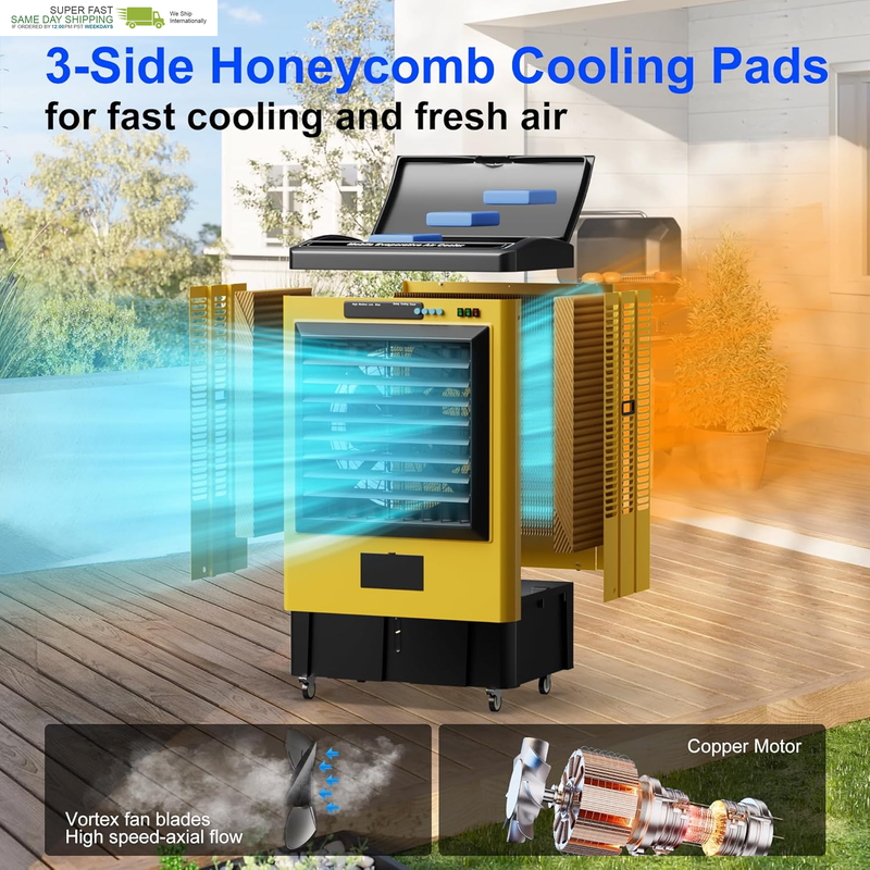 Powerful Cooling Performance: Equipped with 3 high-density evaporative cooling pads, this air cooler maximizes surface area for faster, colder airflow. Its robust fan motor ensures rapid cooling, while 3 included ice packs chill the water further, delivering refreshingly cool air and effectively lowering temperatures.