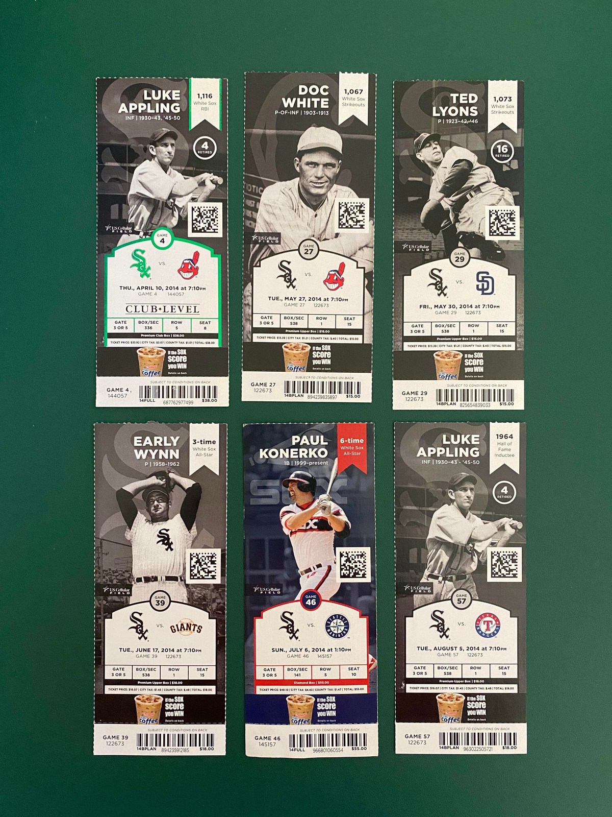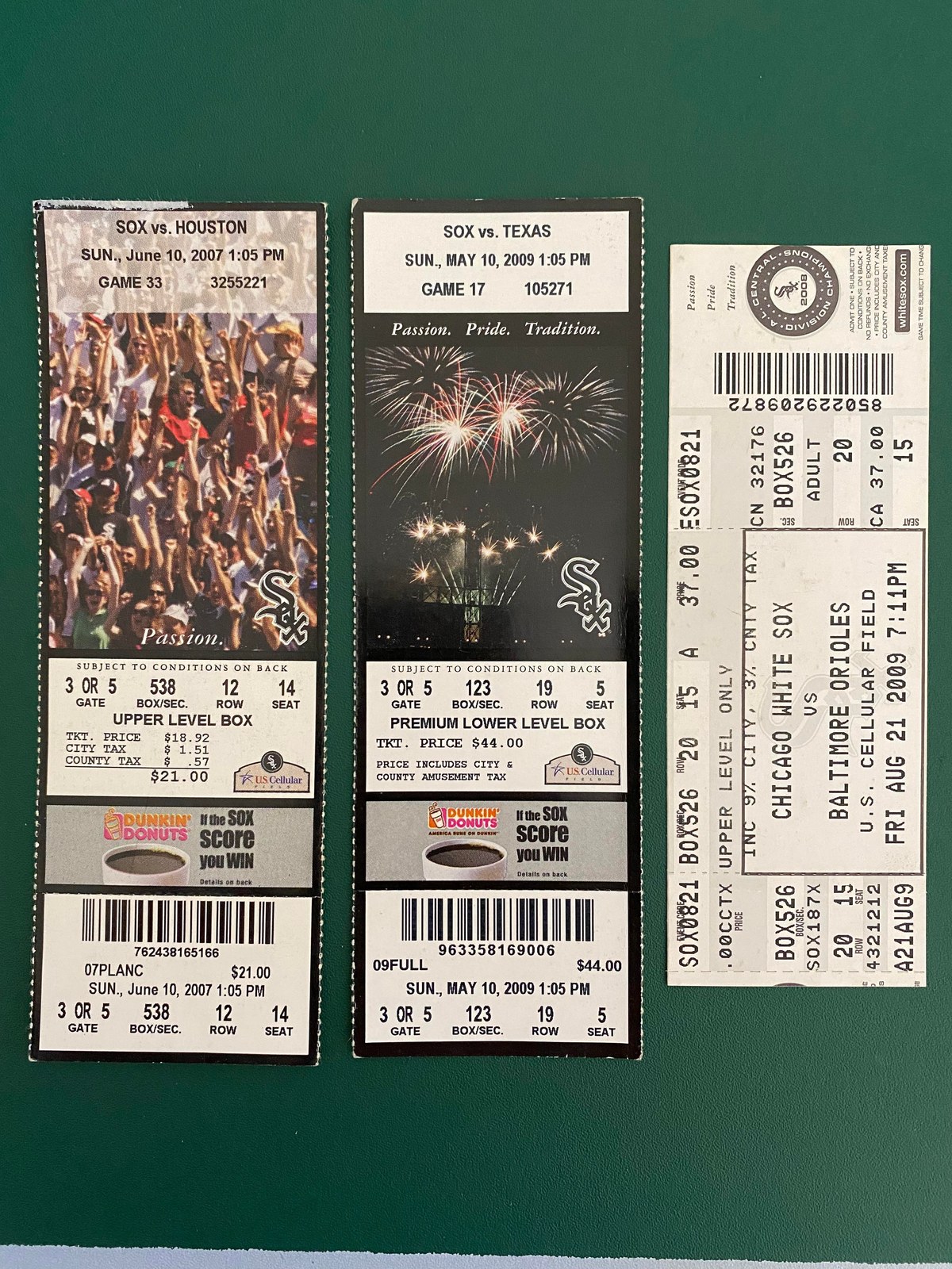 Chicago White Sox Asst. Ticket Stubs $8 each: 6-10-07 Vs Houston, 5-10-09 Vs Texas, 8-21-09 Vs Baltimore, and 2014 4-10 Vs Cleveland, 5-27 Vs Cleveland, 5-30 Vs San Diego, 6-17 Vs. San Francisco, 7-6 Vs Seattle, and 8-5 Vs Texas. I also have hundreds of MLB/NHL/NBA/NFL/College tickets in stock and ready to ship!