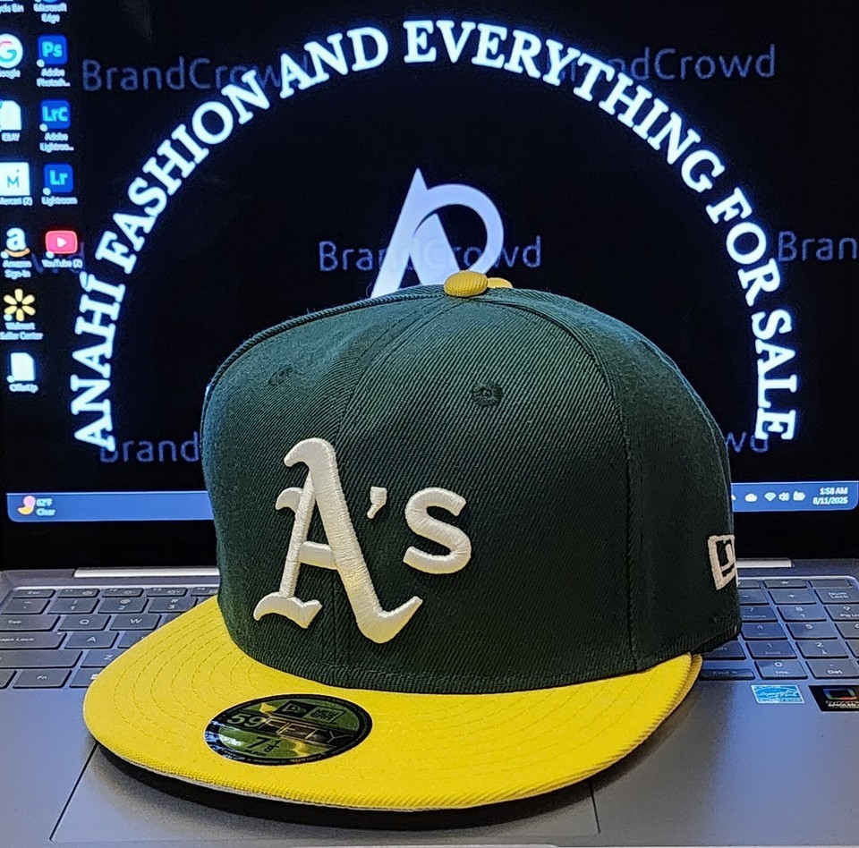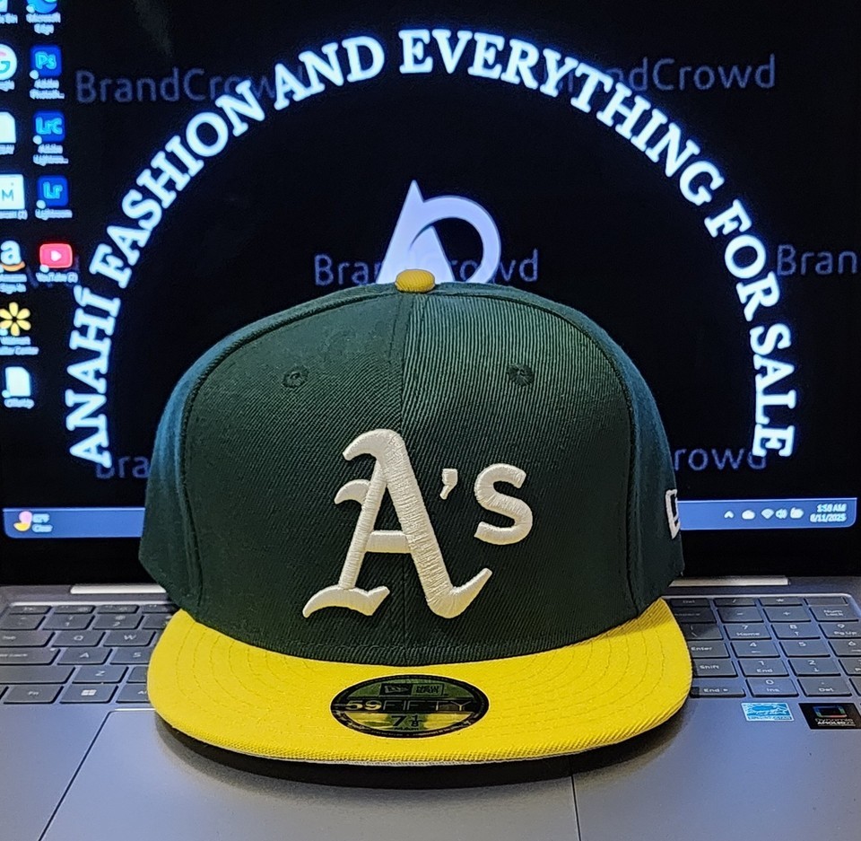 The MLB-Oakland Athletics 59FIFTY Fitted New Era Green/Yellow/White Hat is a stylish and versatile accessory for any baseball fan. Made with lightweight and insulated polyester material, this baseball cap is perfect for all seasons and occasions, from casual outings to formal events. The classic green, yellow, and white color scheme, along with the iconic A'S character, make it a timeless piece that showcases your team spirit. Whether you're traveling, attending a party, or simply out for a casual look, this fitted hat is sure to add a sporty touch to your ensemble.