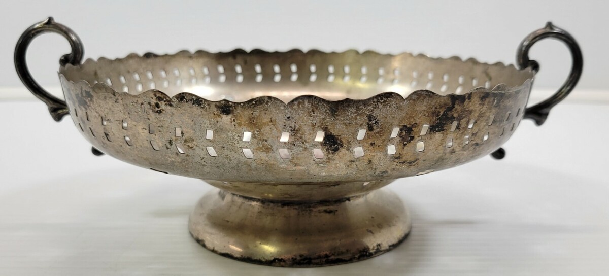 Bowl is in vintage condition with signs of age and years of storage including some heavy tarnish and discoloration which would require proper cleaning/polishing. It does not appear to be pitted.