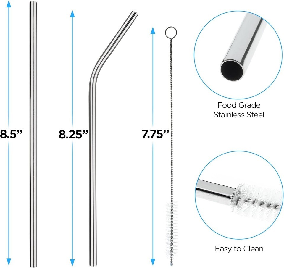 Reusable Straws for the whole family - Be an eco-conscious household! The set includes 8 stainless straws (4 straight, 4 bent) and 8 silicone tips, 2 metal straw cleaner brushes and a travel pouch.