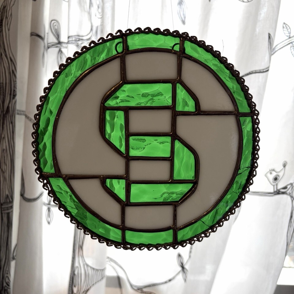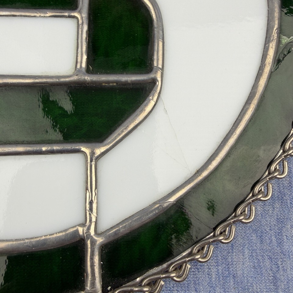 One vintage leaded stained glass sun catcher featuring the Michigan State University block S in translucent green glass surrounded by semi-translucent white glass. The leading is silver in color. The round sun catcher is about 6.75 inches across. There are hooks on the back to attach hanging chain or cord (some clear fishing line is tied on currently). The suncatcher is in good preowned condition ? there are a few smaller chips in parts of the glass (please see pictures) but it had been hanging until recently and feels structurally sound. If I?m remembering correctly, this was handmade by a local shop in Fenton, Michigan in the late 90s / early 2000s. From a smoke-free home. Ships next day!
