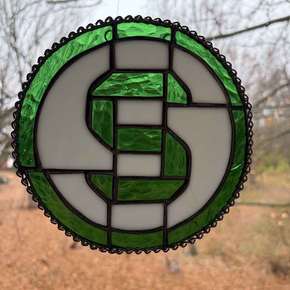 - MSU Leaded Stained Glass Sun Catcher Green White 6.75” VTG Michigan State READ