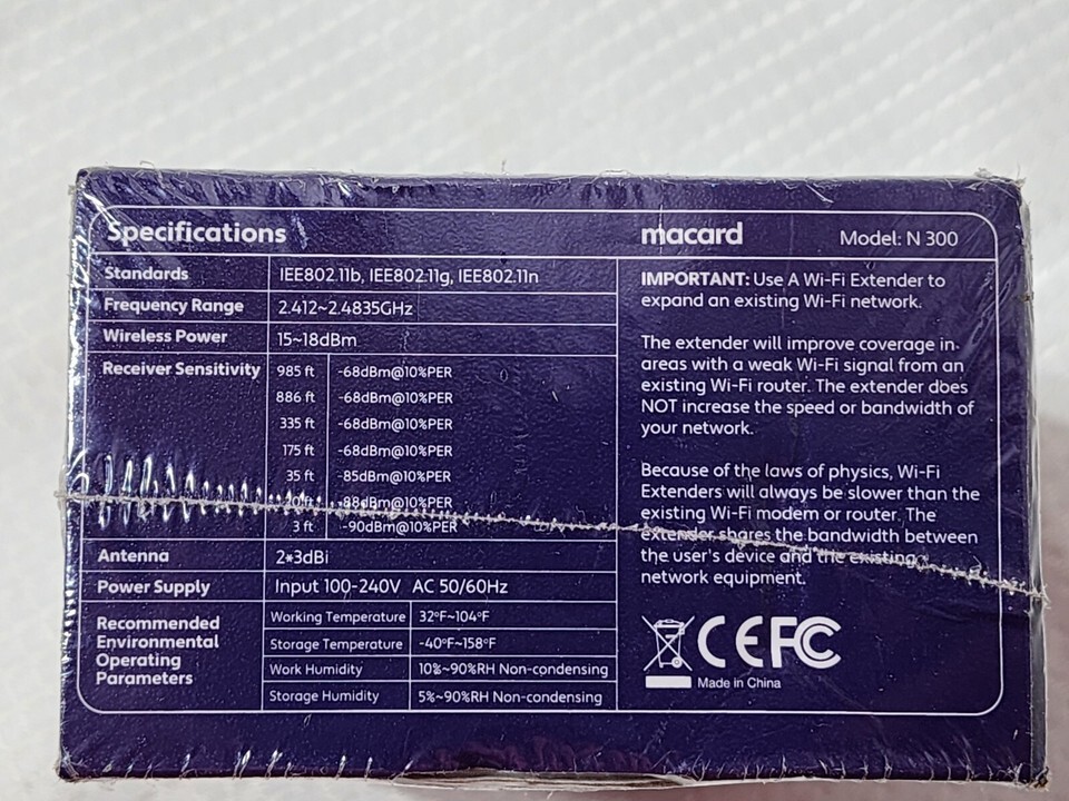 Description of item: Enhance your Wi-Fi coverage with the Macard N300 Wi-Fi Range Extender. Designed to support IEEE 802.11b/g/n wireless standards, this device boosts signal strength across a broad frequency range of 2.412?2.4835GHz. It features dual external antennas providing up to 300 Mbps transfer rates, ideal for improving connectivity in large homes or offices. The extender includes practical features such as easy plug-and-play setup, compact design, and supports encryption to ensure a secure and reliable internet connection. It's perfect for areas with weak Wi-Fi signals, helping eliminate dead zones without increasing the bandwidth of your existing network. Experience stable and extended Wi-Fi coverage with the Macard N300.