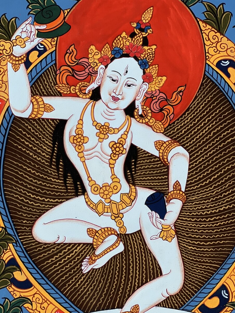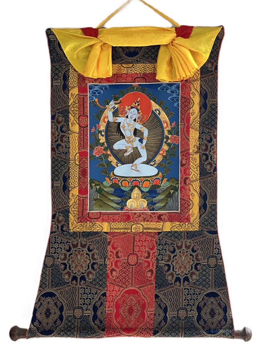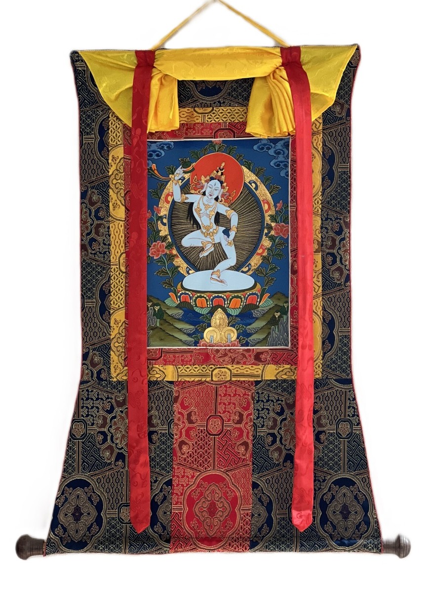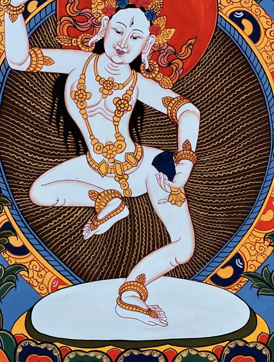 This is an original masterpiece hand-painted Machig Labdron also known as Ahdron Chodron ( in Tibetan) Tibetan Thangka painting bordered with Premium Silk. Machig Labdron is one of the most prominent female masters and lineage holders in Buddhism. She is a reincarnation of Yeshe Tsogyal and the renowned 11th-century Tibetan tantric Buddhist master and yogini that originated several Tibetan lineages of the Vajrayana practice of Chod. Machig Labdron is "a radical synthesis of the Prajnaparamita tradition and tantra guru yoga that 'cuts' through the ego.