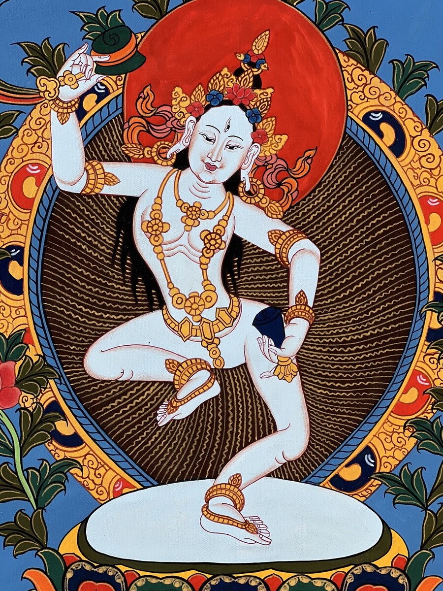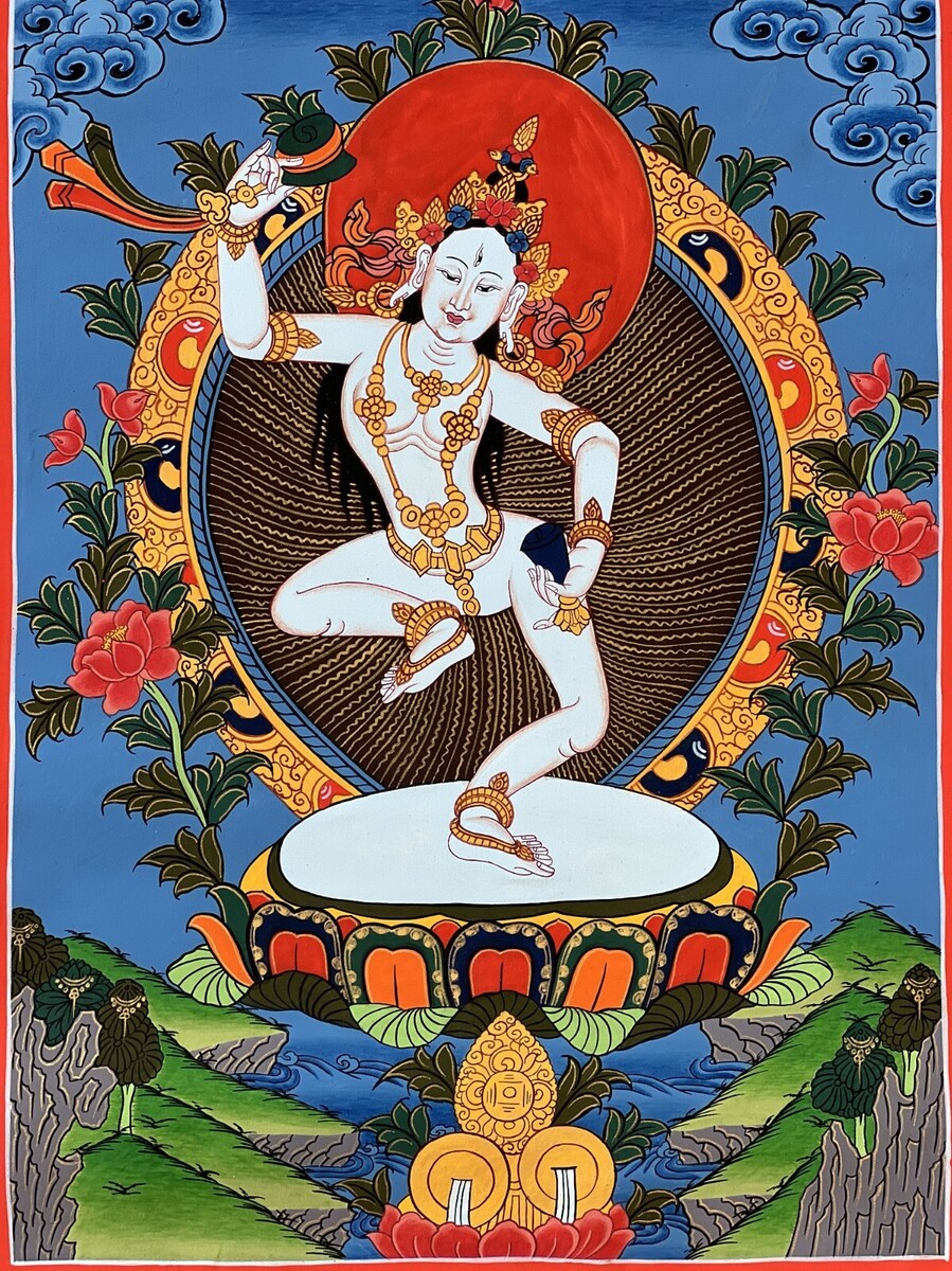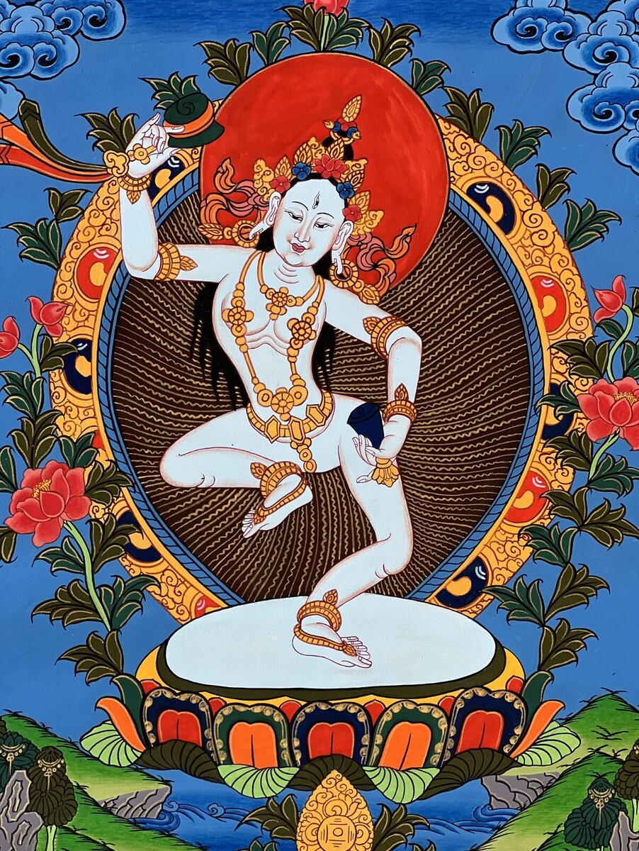 This is an original masterpiece hand-painted Machig Labdron also known as Ahdron Chodron ( in Tibetan) Tibetan Thangka painting bordered with Premium Silk. Machig Labdron is one of the most prominent female masters and lineage holders in Buddhism. She is a reincarnation of Yeshe Tsogyal and the renowned 11th-century Tibetan tantric Buddhist master and yogini that originated several Tibetan lineages of the Vajrayana practice of Chod. Machig Labdron is "a radical synthesis of the Prajnaparamita tradition and tantra guru yoga that 'cuts' through the ego.