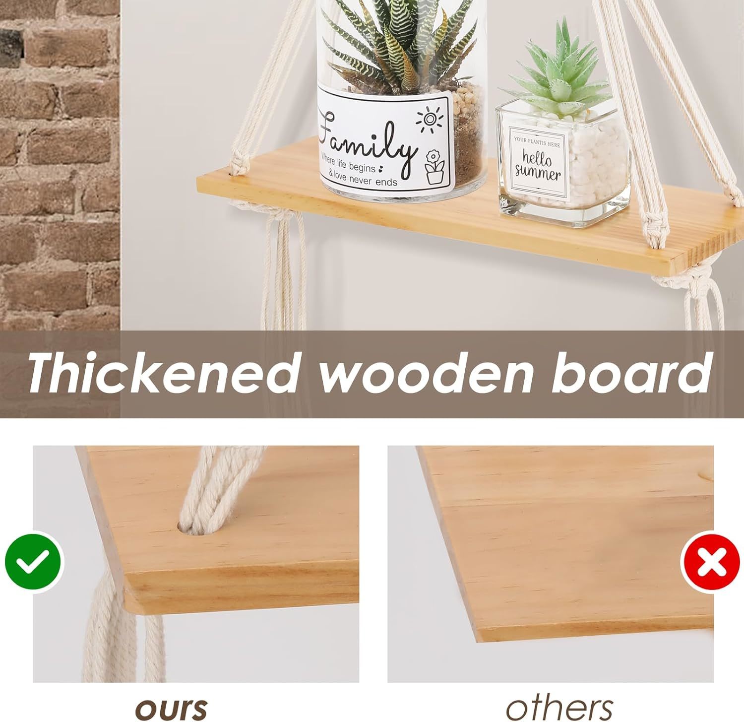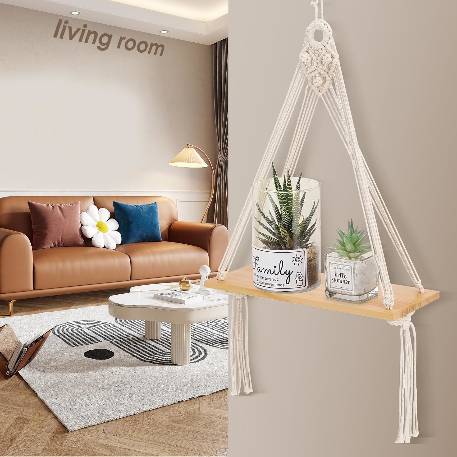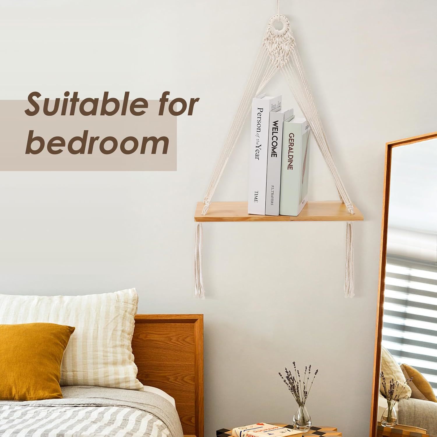 ?High-Quality Material?The macrame wall hanging shelf made from hand woven cotton rope and natural strong thick pine wood shelf with hand-woven tassels.Each shelf is cut from renewable wood, ensuring that each one has unique wood grain.These rope shelves can hold up to 8-10 lbs for each shelf, making them sturdy and reliable for storing your favorite items to match any rustic, bohemian,contemporary or minimalist home decor. ?Multi-Scene Multi-Use?This floating shelves for wall with macrame rope is suitable for your apartment, dorm room, dining room, living room, bedroom, gardens, patio, balcony, office, kitchen, and etc.Not only are these shelves perfect for storing books, collectibles, small items, photo frames, and art souvenirs, they also serve as beautiful wall decor. also as a plant shelf to display your indoor planters. It goes perfectly with your bohemian minimalist room. ?Easy to Hang?This boho wall decor shelf requires no assembly, just mount the hook on the wall, a wooden ring on the top helps you easily hang the shelves in any place you want.?Includes two hooks?such an easy installation could be done in a few seconds.Our hanging shelves are more than just functional storage solutions - they're a simple way to elevate the ambiance of any room. ?Great Gift Idea?The wall decor for bedroom can be a great gift choice for everyone.Share Your Love With this boho room decor to your family and friends.This beautiful and unique shelves for wall decor is a perfect and unique gift idea for your wife, daughter, mother, friends and colleagues.floating wood shelves are ideal for housewarmings, birthday, anniversary, wedding, Valentine's Day, Mother's Day, Thanksgiving, Christmas. ?Quality Customer Service ?Every step of the product is important, we never compromise on high quality. If you have any questions about our products, please feel free to contact us through Amazon. We will give you the most satisfactory solution within 24 hours. If the floating shelves is not in perfect condition or does not meet your expectations, we will fully refund or send a replacement.