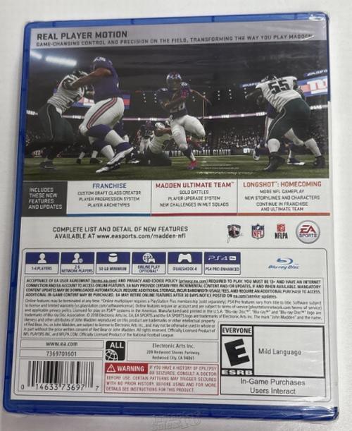 The product is Madden NFL 19 for the Sony PlayStation 4, published by Electronic Arts in 2018. It is a sports video game with a sub-genre of American football, suitable for all ages with an E rating. The game offers features such as multiplayer and online playability, with inserts included.