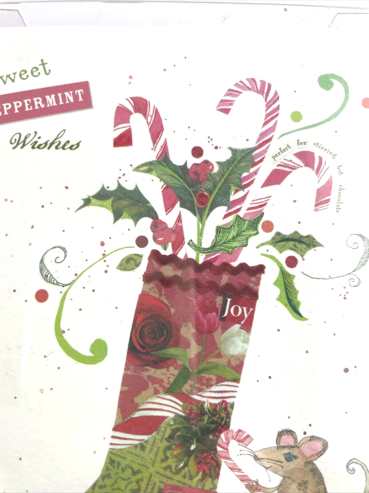 Cards have a large Christmas stocking filled with candy canes. A cute mouse stands nearby holding his own candy cane. The front of the card has the sentiment Sweet Peppermint Wishes,while the inside of the cards read "Happy Happy Holidays." Cards measure approximately 4.25" x 6"
