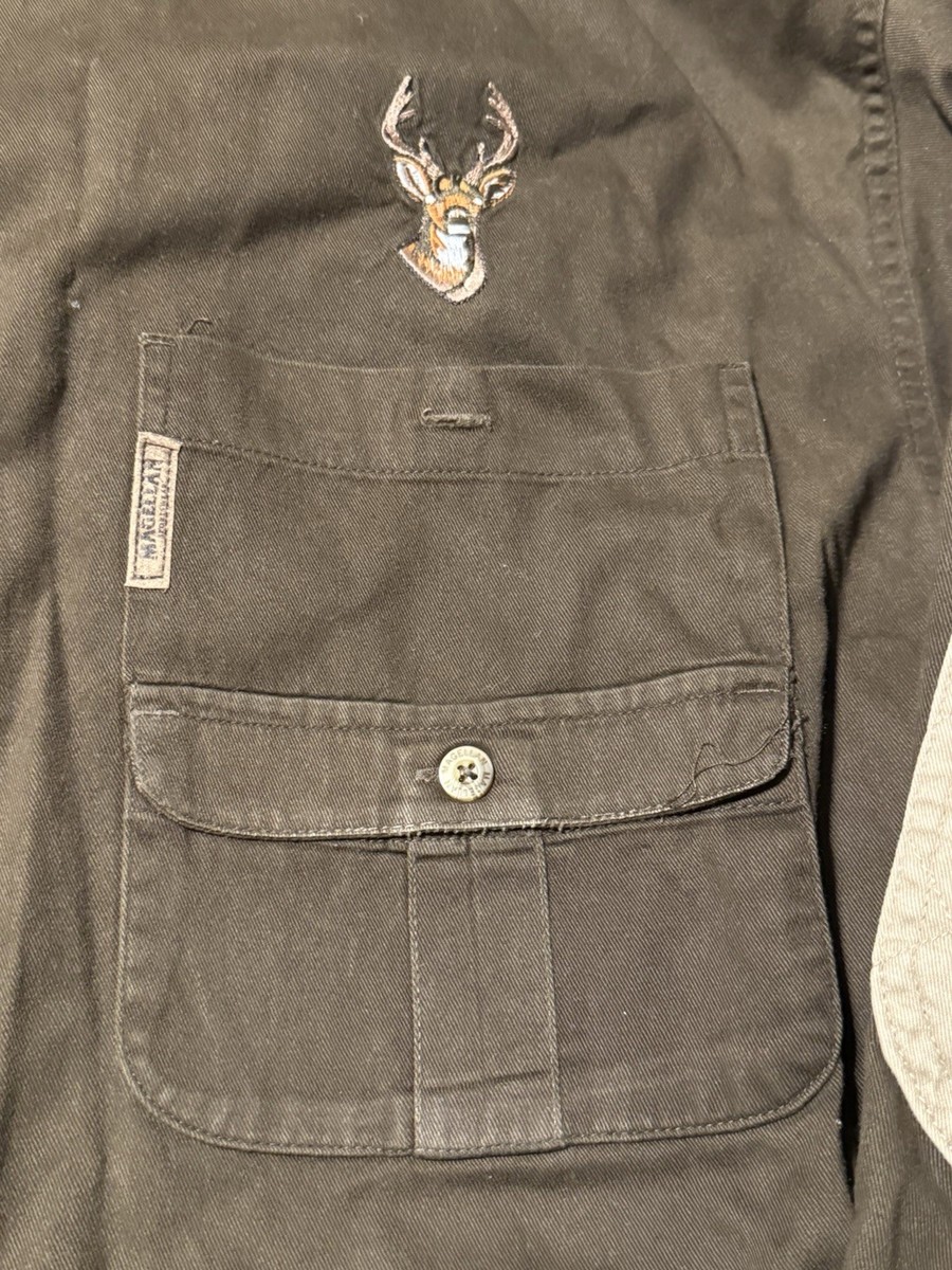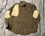 This Magellan Sportswear XXL upland/hunting shirt features quilted shooting patches and a rugged field-ready build. The shirt is a brown canvas/earth-tone color, paired with tan quilted patches on the shoulder and elbows ? perfect for range use, field days, or outdoor work.